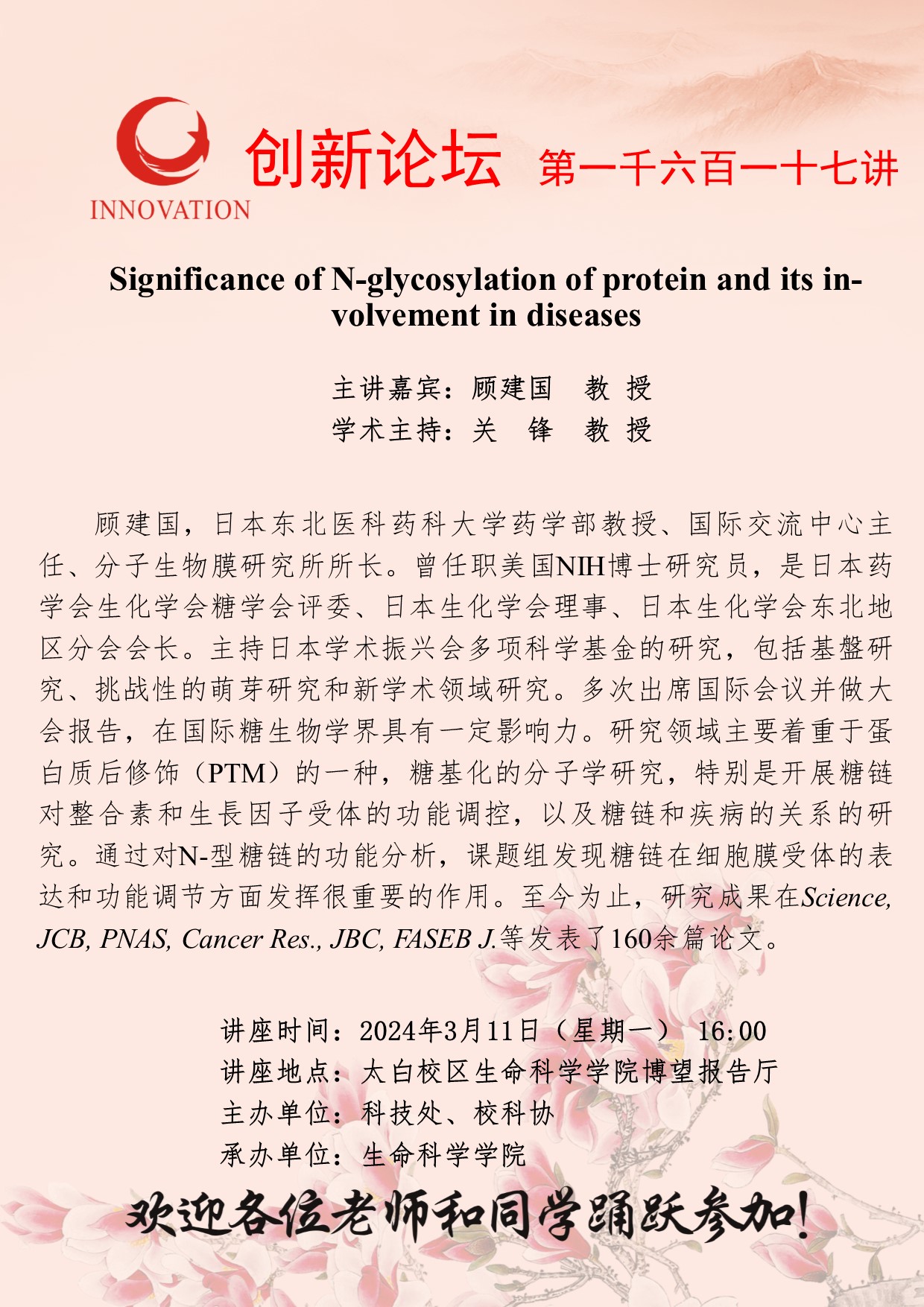 顾建国 教授 bat365正版唯一官网创新论坛第一千六百一十七讲:Significance of N-glycosylation of protein and its involvement in diseases 讲座时间 2024年3月11日(星期一) 16:00 讲座地点 太白校区生命科学学院博望报告厅 讲座人介绍 顾建国 教授 讲座内容
