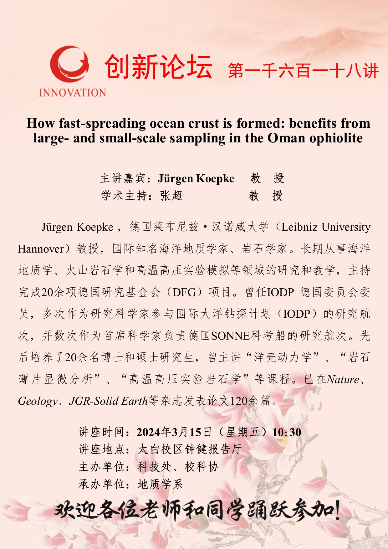 Jürgen Koepke 教 授 bat365正版唯一官网创新论坛第一千六百一十八讲:How fast-spreading ocean crust is formed: benefits from large- and small-scale sampling in the Oman ophiolite 讲座时间 2024年3月15日(星期五)10:30 讲座地点 太白校区钟健报告厅 讲座人介绍 Jürgen Koepke 教 授 讲座内容