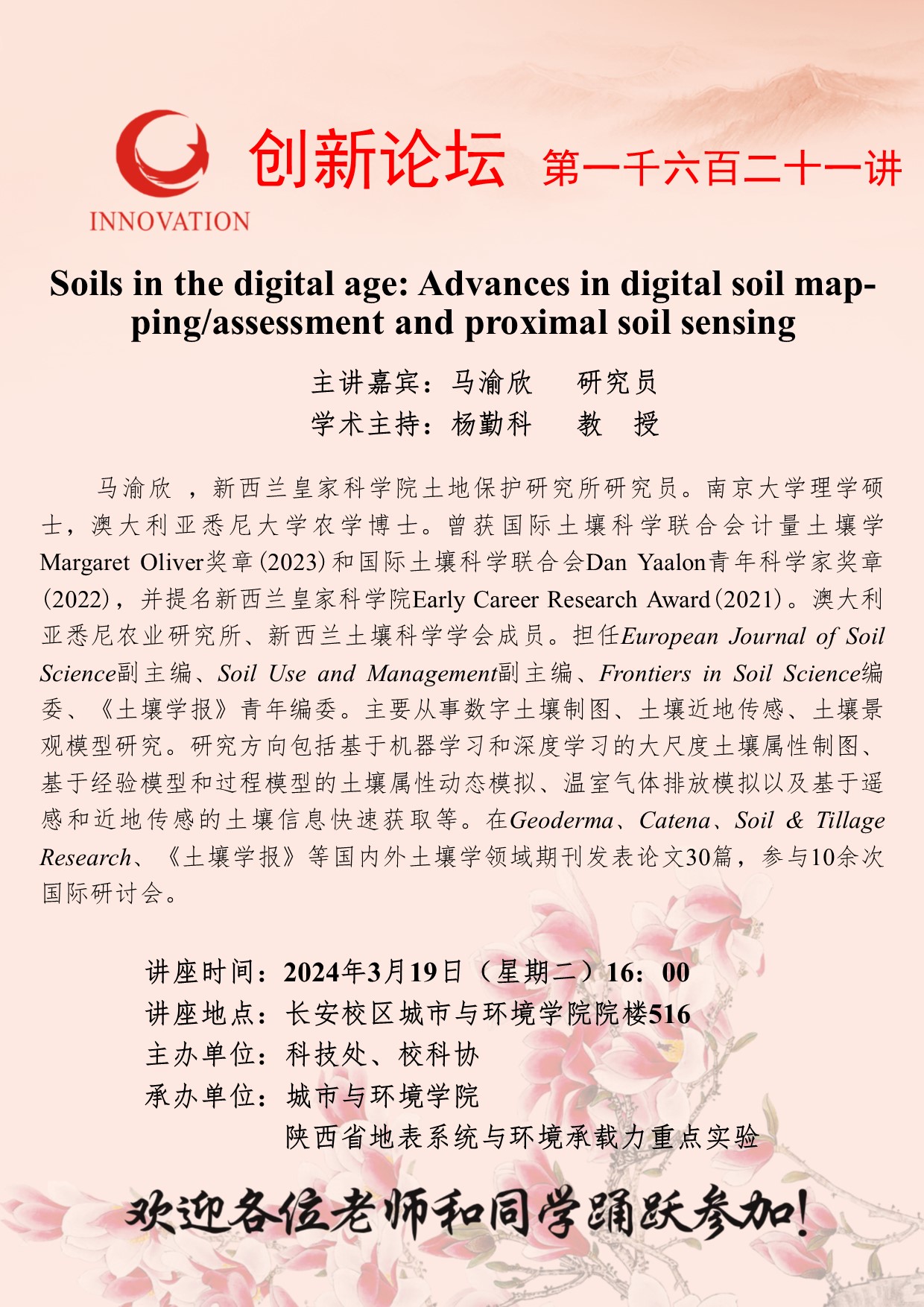 马渝欣 研究员 bat365正版唯一官网创新论坛第一千六百二十一讲:Soils in the digital age: Advances in digital soil mapping/assessment and proximal soil sensing 讲座时间 2024年3月19日(星期二)16:00 讲座地点 长安校区城市与环境学院院楼516 讲座人介绍 马渝欣 研究员 讲座内容