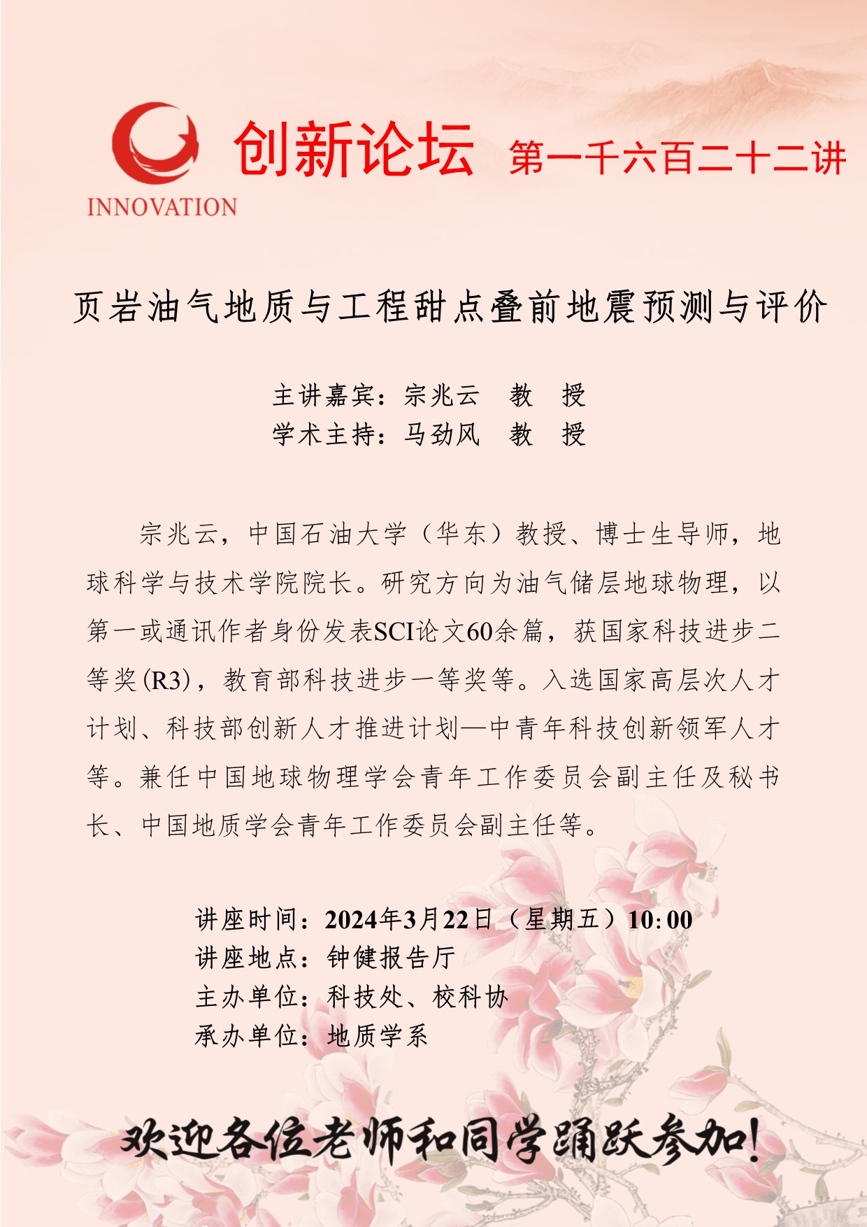 宗兆云 教授 bat365正版唯一官网创新论坛第一千六百二十二讲:页岩油气地质与工程甜点叠前地震预测与评价 讲座时间 2024年3月22日(星期五)10:00 讲座地点 钟健报告厅 讲座人介绍 宗兆云 教授 讲座内容
