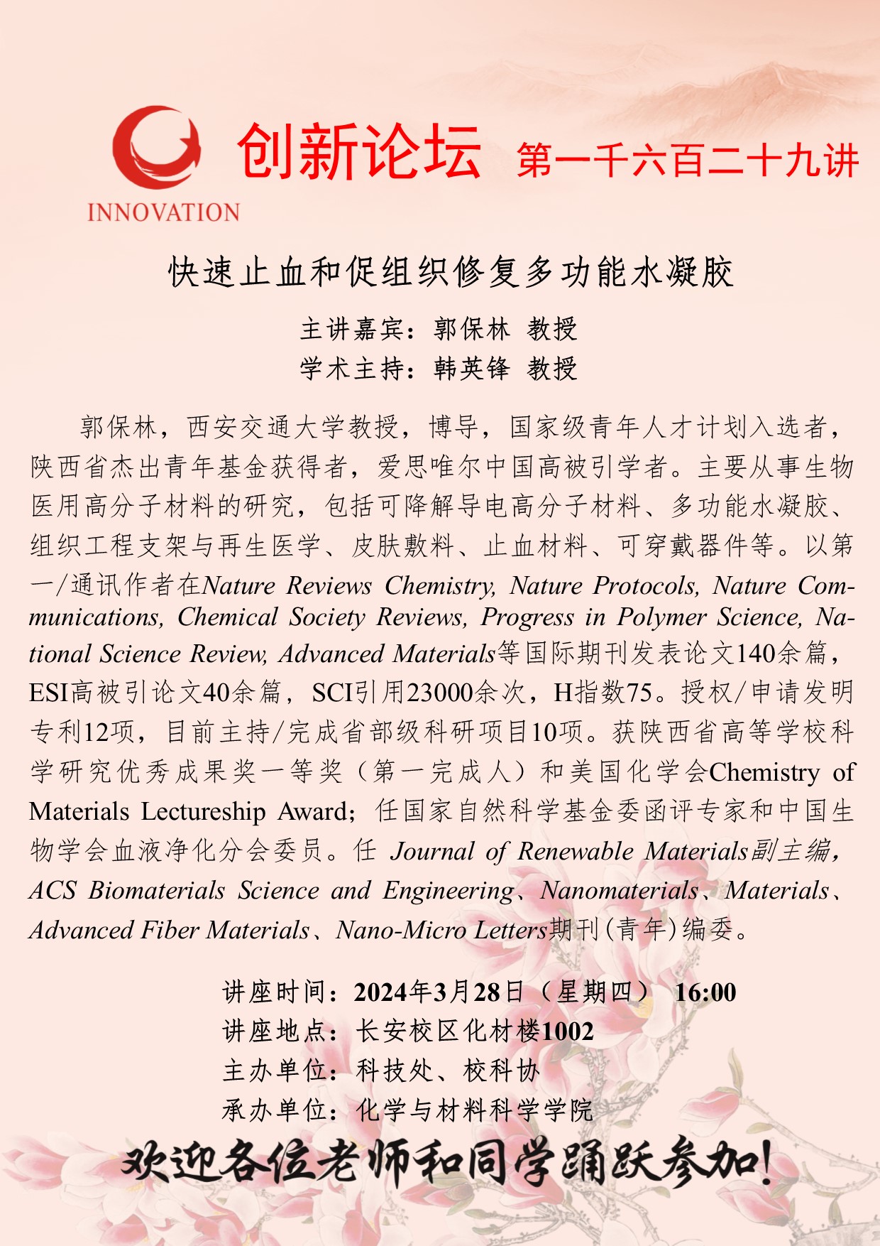 郭保林 教授 bat365正版唯一官网创新论坛第一千六百二十九讲:快速止血和促组织修复多功能水凝胶 讲座时间 2024年3月28日(星期四) 16:00 讲座地点 长安校区化材楼1002 讲座人介绍 郭保林 教授 讲座内容