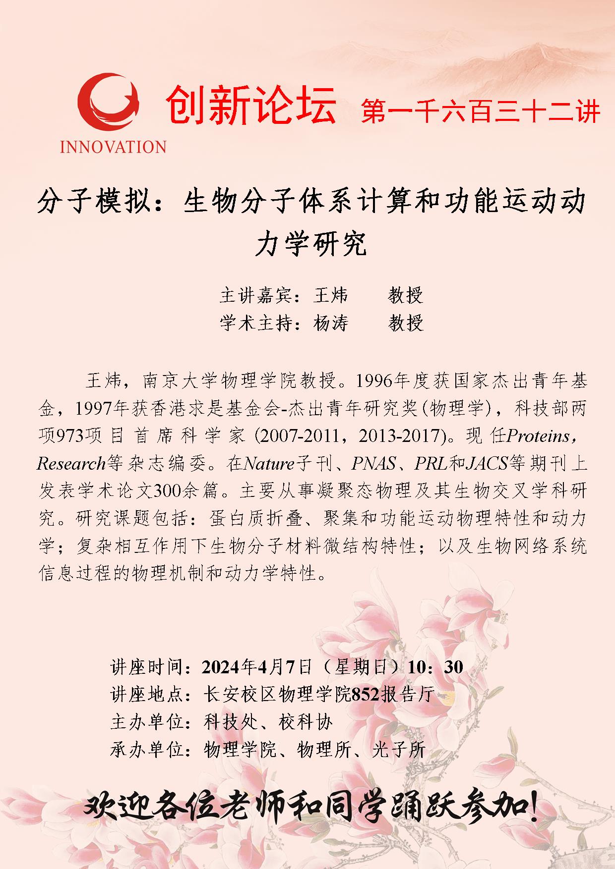 王炜 教授 bat365正版唯一官网创新论坛第一千六百三十二讲:分子模拟:生物分子体系计算和功能运动动力学研究 讲座时间 2024年4月7日(星期日)10:30 讲座地点 长安校区物理学院852报告厅 讲座人介绍 王炜 教授 讲座内容