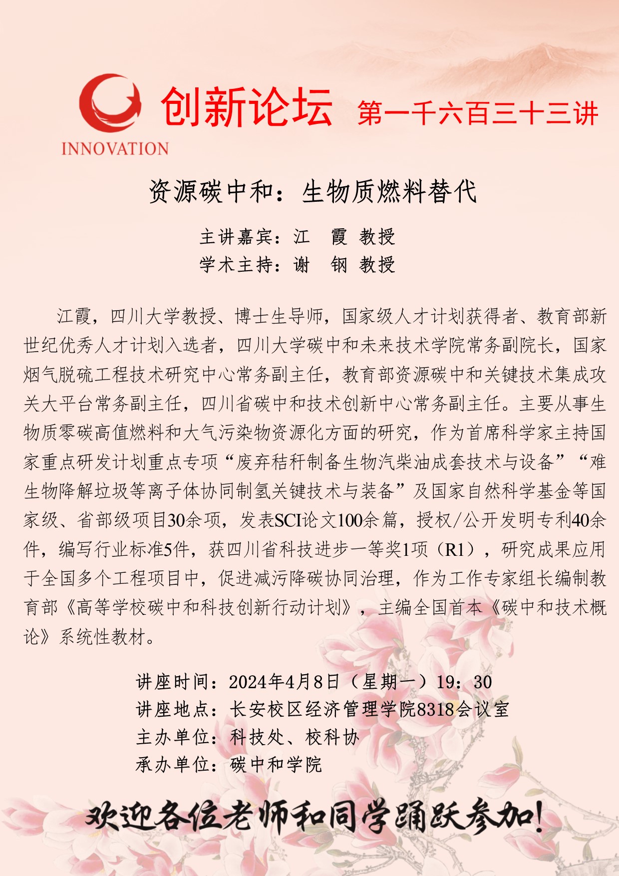 江霞 教授 bat365正版唯一官网创新论坛第一千六百三十三讲:资源碳中和:生物质燃料替代 讲座时间 2024年4月8日(星期一)19:30 讲座地点 长安校区经济管理学院8318会议室 讲座人介绍 江霞 教授 讲座内容