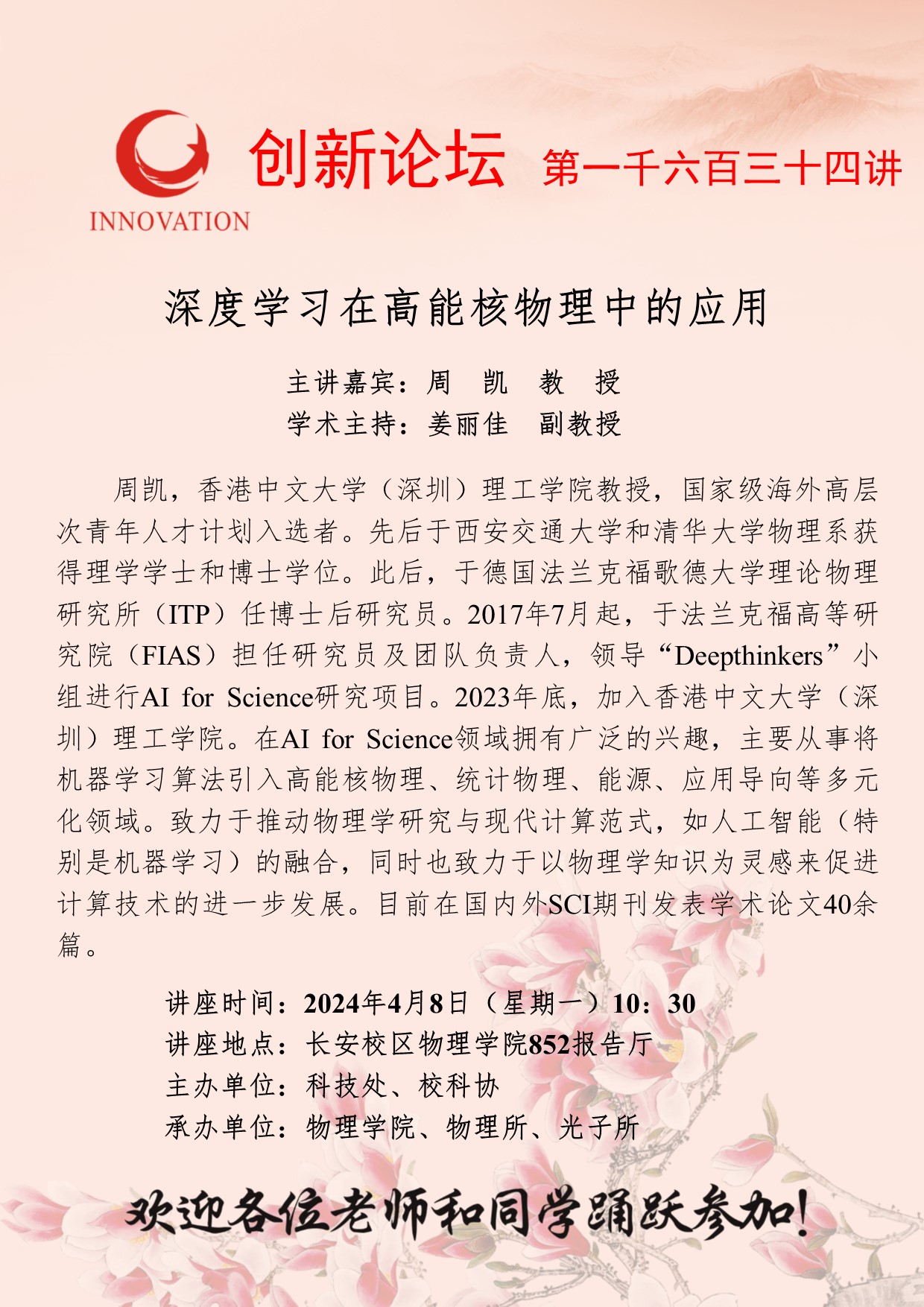 周凯 教授 bat365正版唯一官网创新论坛第一千六百三十四讲:深度学习在高能核物理中的应用 讲座时间 2024年4月8日(星期一)10:30 讲座地点 长安校区物理学院852报告厅 讲座人介绍 周凯 教授 讲座内容