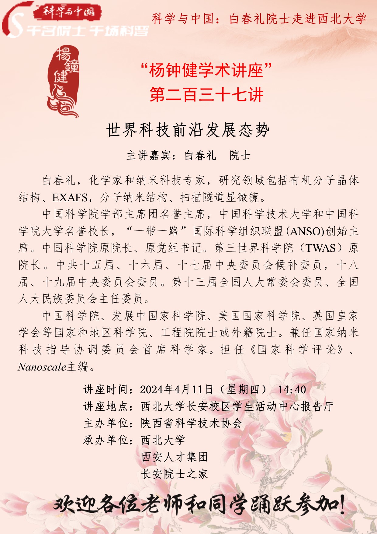 白春礼 院士 “杨钟健学术讲座”第二百三十七讲:世界科技前沿发展态势 讲座时间 2024年4月11日(星期四) 14:40 讲座地点 bat365正版唯一官网长安校区学生活动中心报告厅 讲座人介绍 白春礼 院士 讲座内容