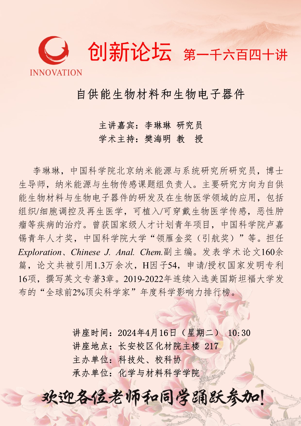 李琳琳 研究员 bat365正版唯一官网创新论坛第一千六百四十讲:自供能生物材料和生物电子器件 讲座时间 2024年4月16日(星期二) 10:30 讲座地点 长安校区化材院主楼 217 讲座人介绍 李琳琳 研究员 讲座内容