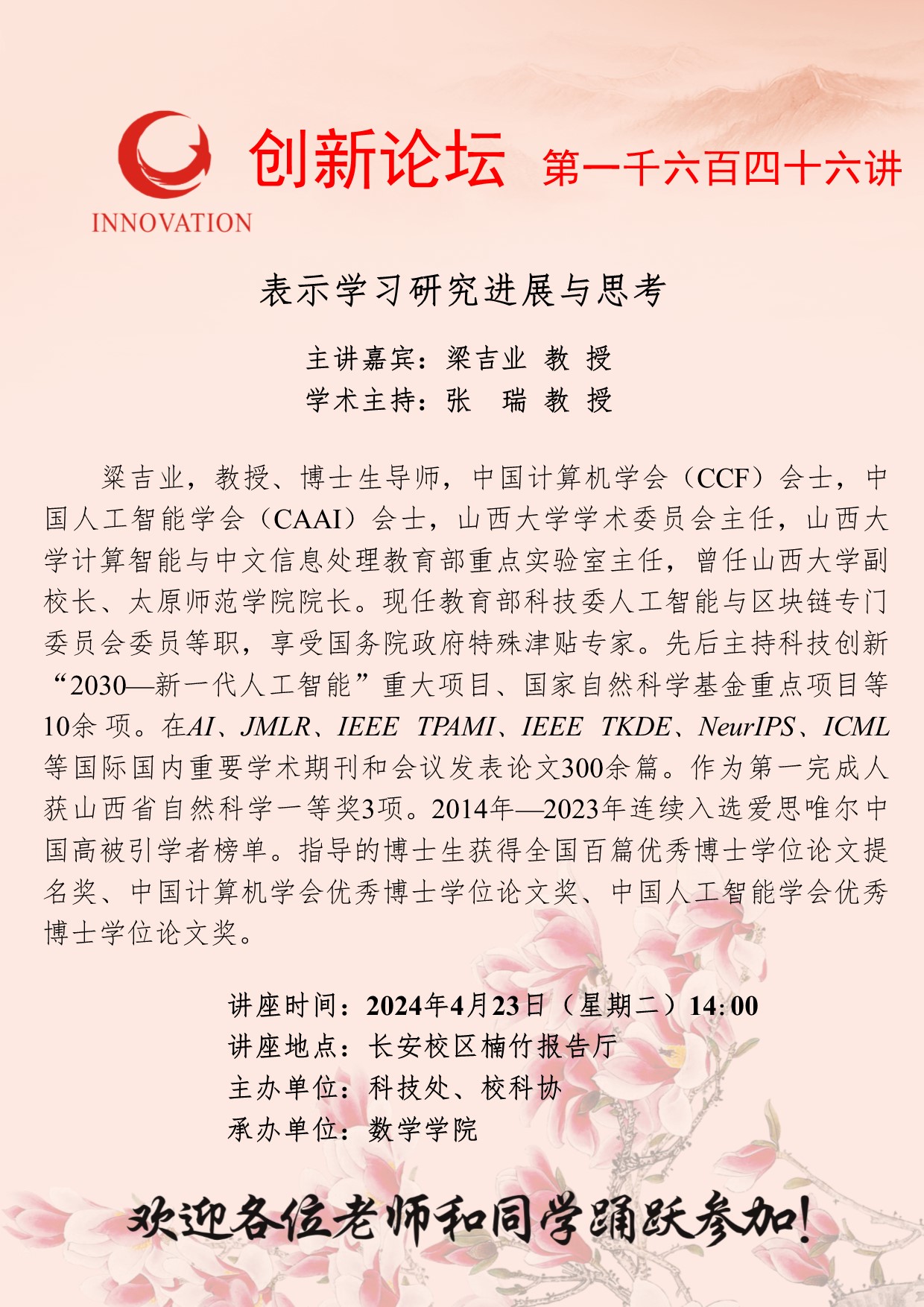梁吉业 教授 bat365正版唯一官网创新论坛第一千六百四十六讲:表示学习研究进展与思考 讲座时间 2024年4月23日(星期二)14:00 讲座地点 长安校区楠竹报告厅 讲座人介绍 梁吉业 教授 讲座内容
