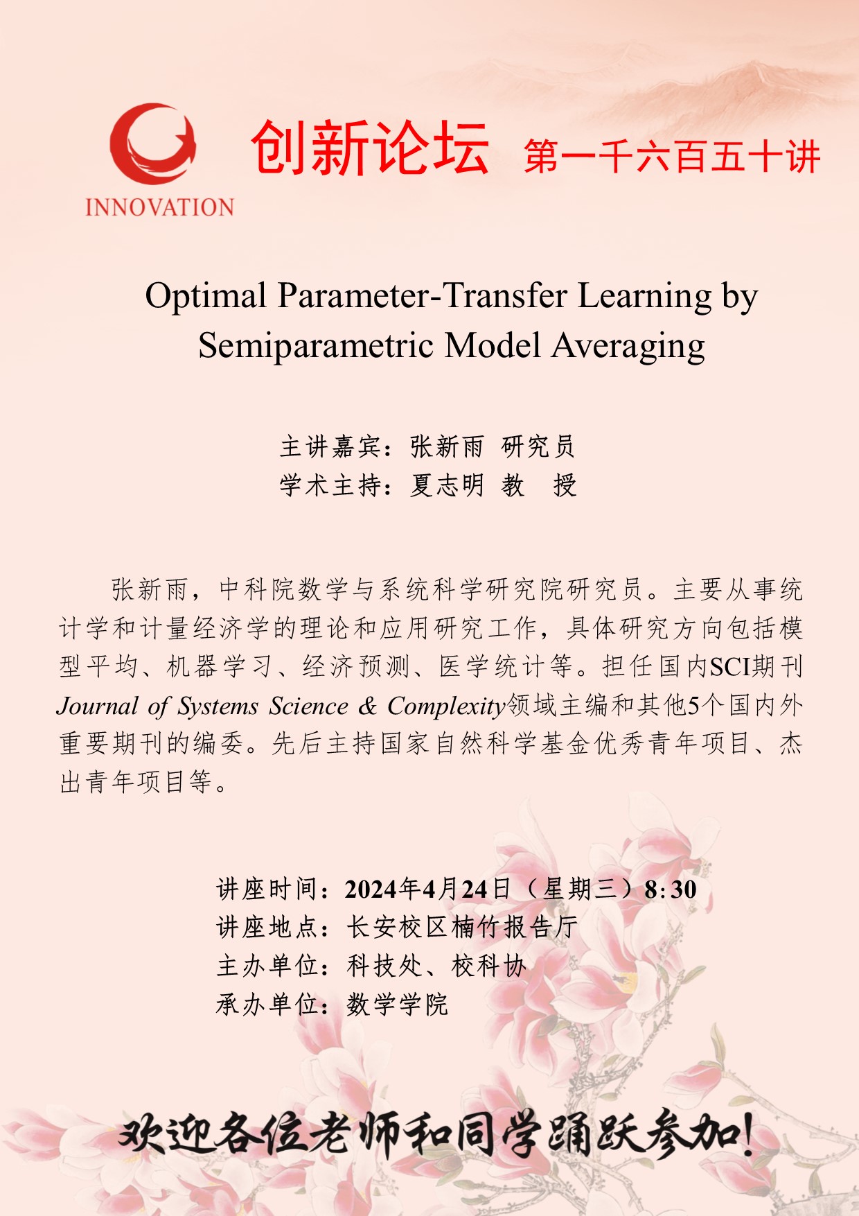 张新雨 研究员 bat365正版唯一官网创新论坛第一千六百五十讲:Optimal Parameter-Transfer Learning by Semiparametric Model Averaging 讲座时间 2024年4月24日(星期三)8:30 讲座地点 长安校区楠竹报告厅 讲座人介绍 张新雨 研究员 讲座内容