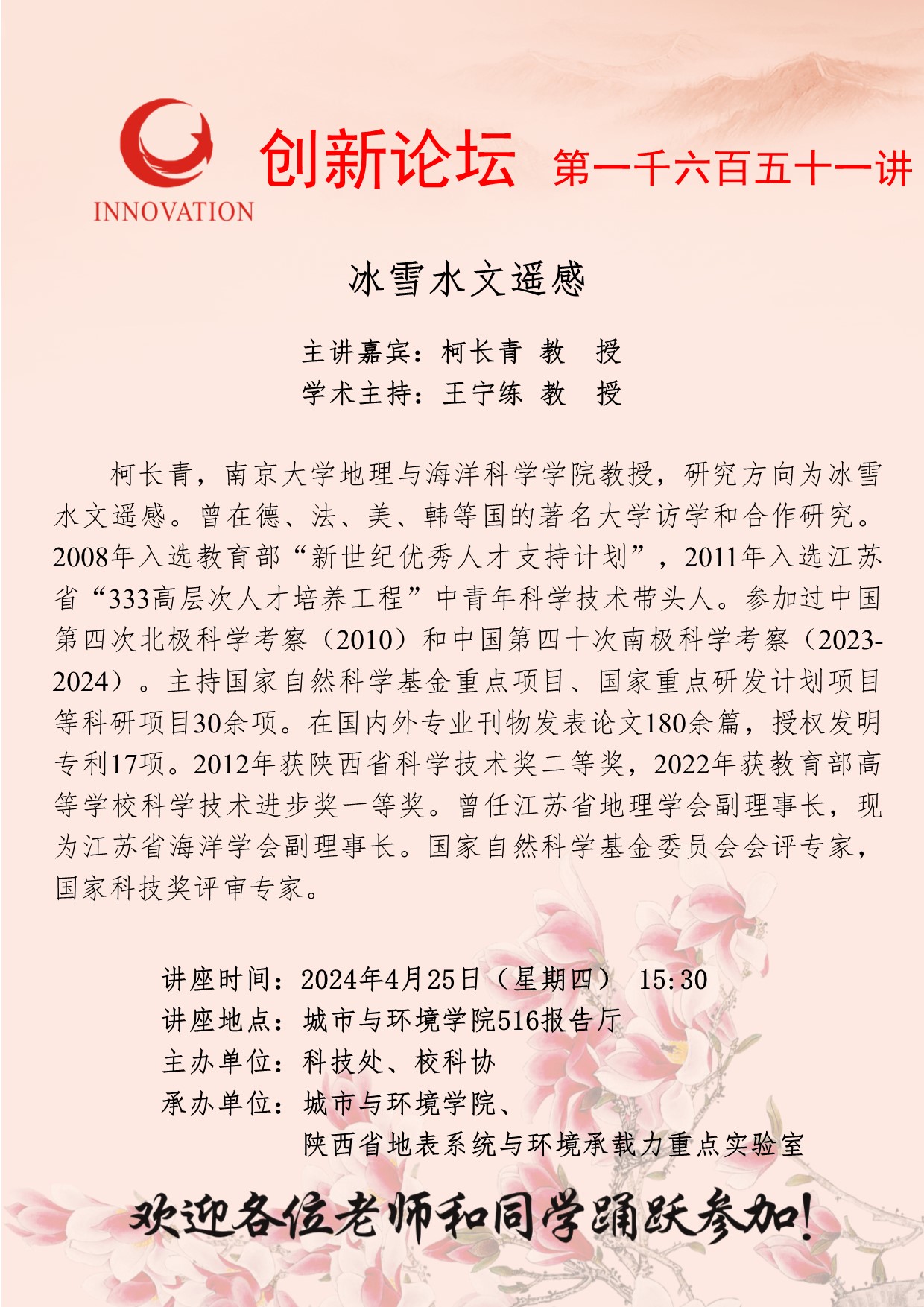 柯长青 教 授 bat365正版唯一官网创新论坛第一千六百五十一讲:冰雪水文遥感 讲座时间 2024年4月25日(星期四) 15:30 讲座地点 城市与环境学院516报告厅 讲座人介绍 柯长青 教 授 讲座内容