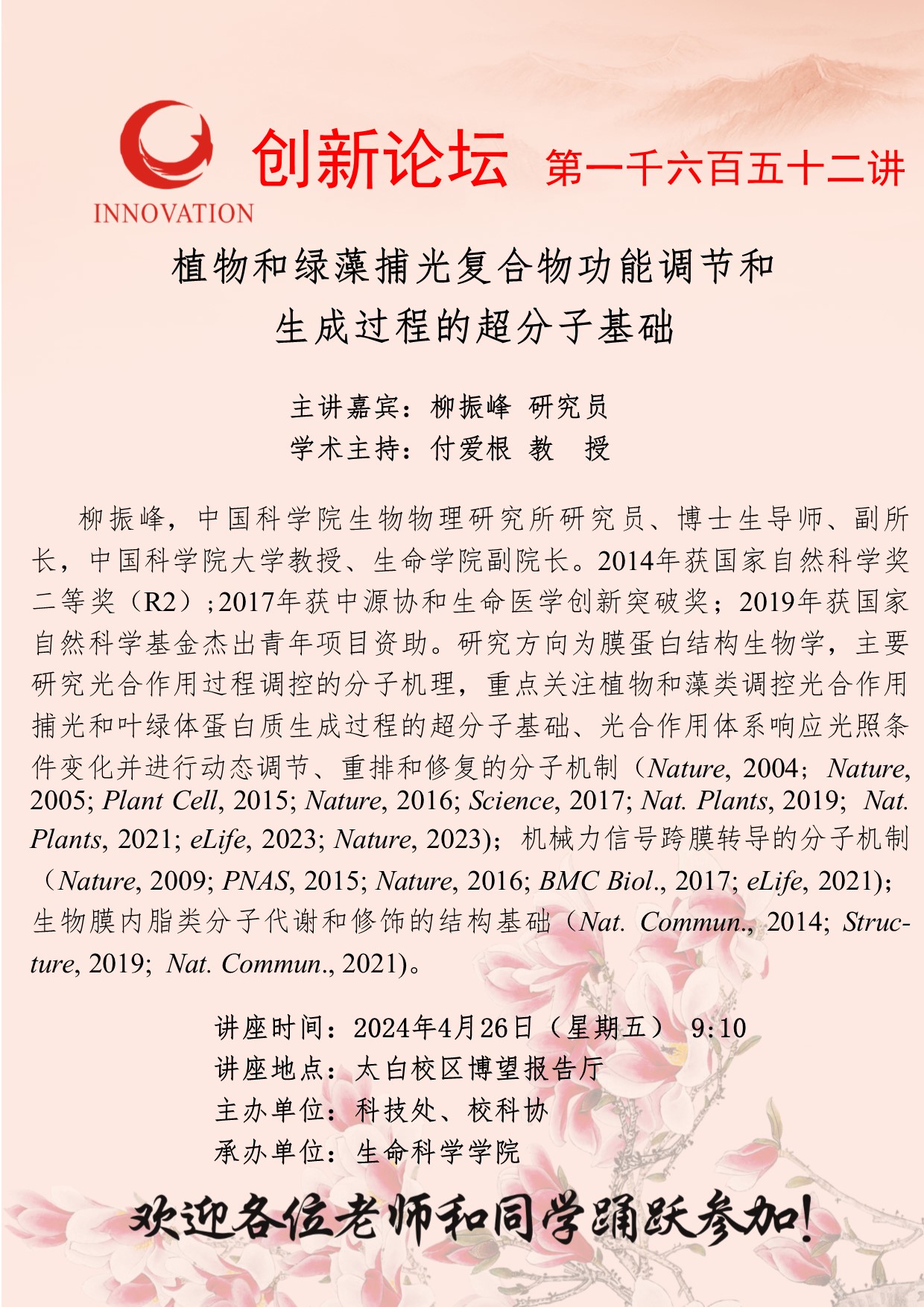 柳振峰 研究员 bat365正版唯一官网创新论坛第一千六百五十二讲:植物和绿藻捕光复合物功能调节和生成过程的超分子基础 讲座时间 2024年4月26日(星期五) 9:10 讲座地点 太白校区博望报告厅 讲座人介绍 柳振峰 研究员 讲座内容