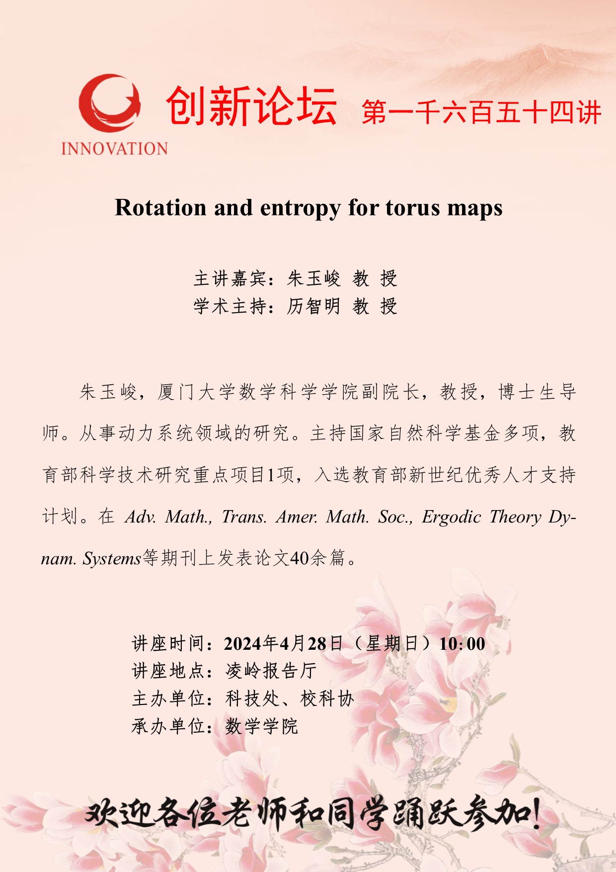 朱玉峻 教授 bat365正版唯一官网创新论坛第一千六百五十四讲:Rotation and entropy for torus maps 讲座时间 2024年4月28日(星期日)10:00 讲座地点 凌岭报告厅 讲座人介绍 朱玉峻 教授 讲座内容