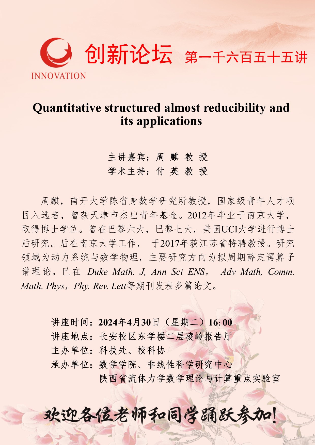 周 麒 教 授 bat365正版唯一官网创新论坛第一千六百五十五讲:Quantitative structured almost reducibility and its applications 讲座时间 2024年4月30日(星期二)16:00 讲座地点 长安校区东学楼二层凌岭报告厅 讲座人介绍 周 麒 教 授 讲座内容