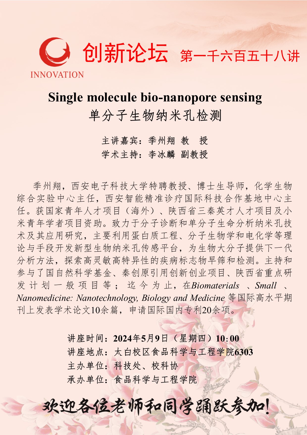 季州翔 教授 bat365正版唯一官网创新论坛第一千六百五十八讲:Single molecule bio-nanopore sensing 讲座时间 2024年5月9日(星期四)10:00 讲座地点 太白校区食品科学与工程学院6303 讲座人介绍 季州翔 教授 讲座内容