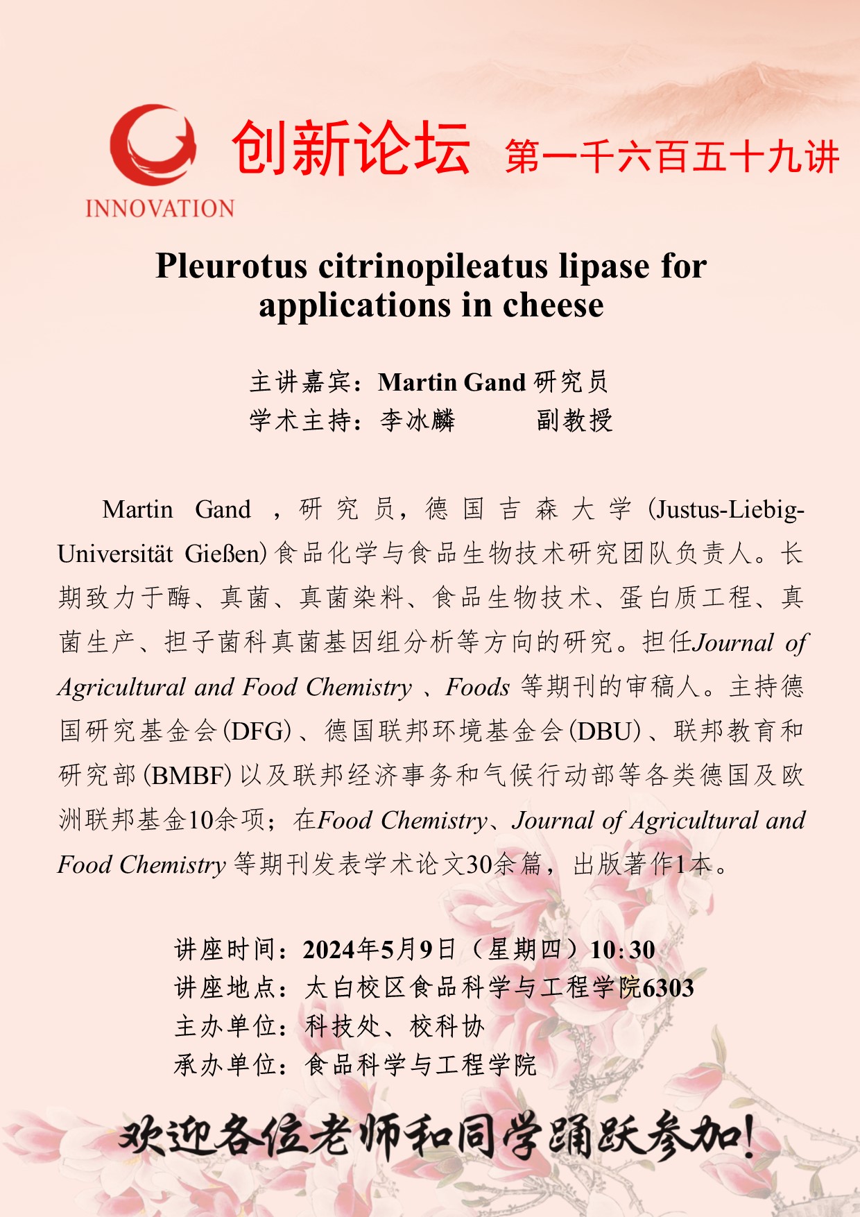 Martin Gand 研究员 bat365正版唯一官网创新论坛第一千六百五十九讲:Pleurotus citrinopileatus lipase for applications in cheese 讲座时间 2024年5月9日(星期四)10:30 讲座地点 太白校区食品科学与工程学院6303 讲座人介绍 Martin Gand 研究员 讲座内容