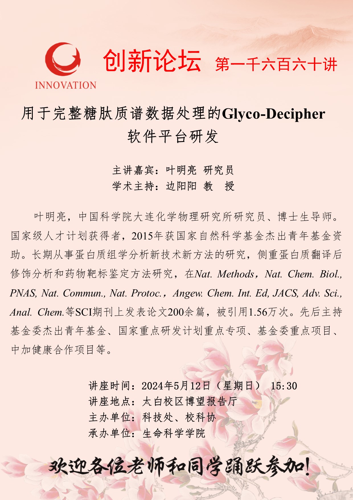 叶明亮 研究员 bat365正版唯一官网创新论坛第一千六百六十讲:用于完整糖肽质谱数据处理的Glyco-Decipher软件平台研发 讲座时间 2024年5月12日(星期日) 15:30 讲座地点 太白校区博望报告厅 讲座人介绍 叶明亮 研究员 讲座内容