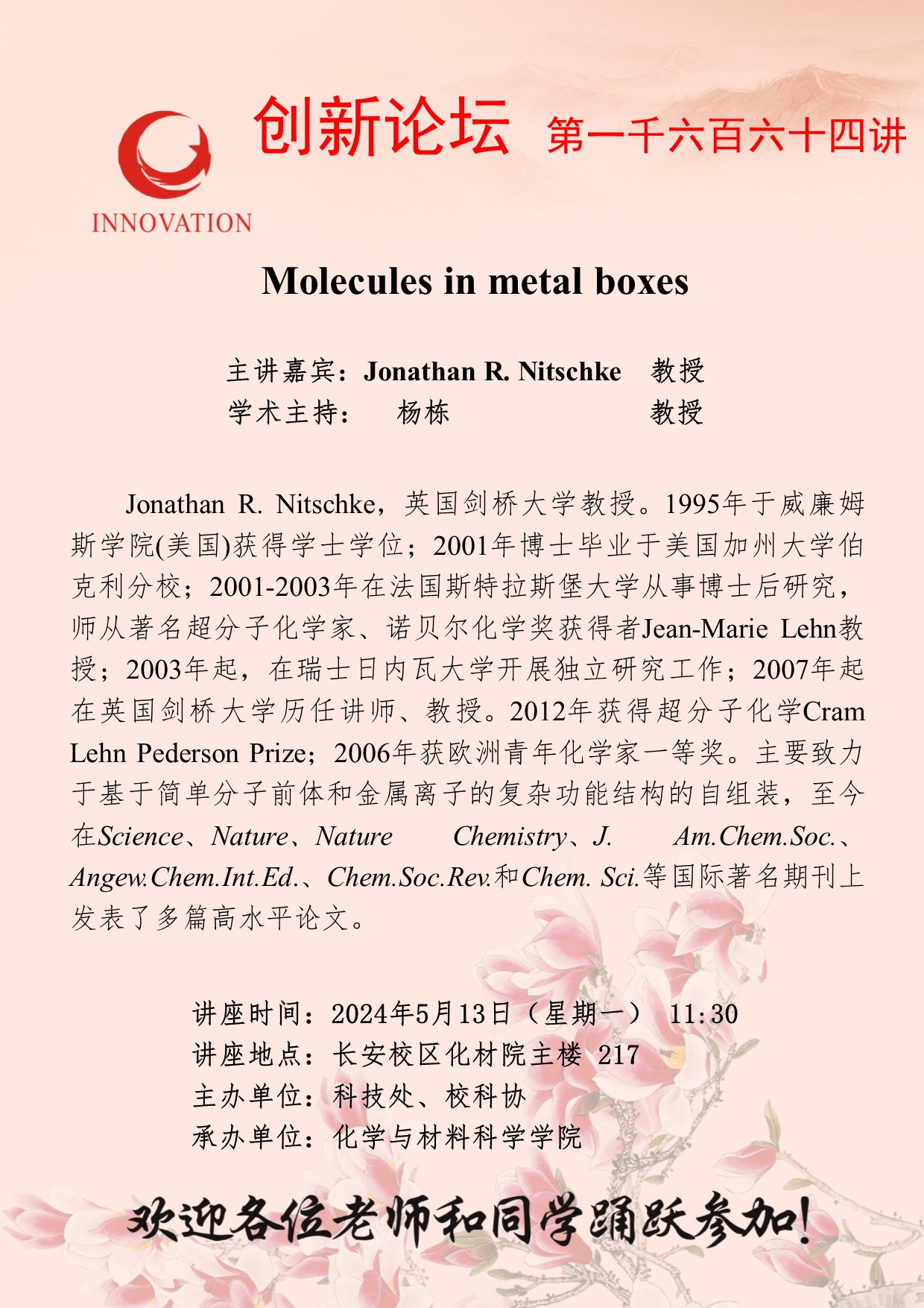 Jonathan R. Nitschke 教授 bat365正版唯一官网创新论坛第一千六百六十四讲:Molecules in metal boxes 讲座时间 2024年5月13日(星期一) 11:30 讲座地点 长安校区化材院主楼 217 讲座人介绍 Jonathan R. Nitschke 教授 讲座内容
