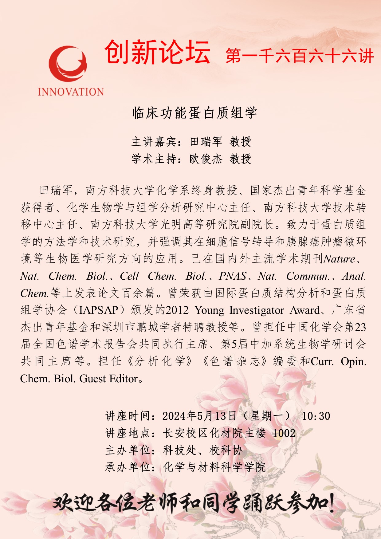 田瑞军 教授 bat365正版唯一官网创新论坛第一千六百六十六讲:临床功能蛋白质组学 讲座时间 2024年5月13日(星期一) 10:30 讲座地点 长安校区化材院主楼 1002 讲座人介绍 田瑞军 教授 讲座内容
