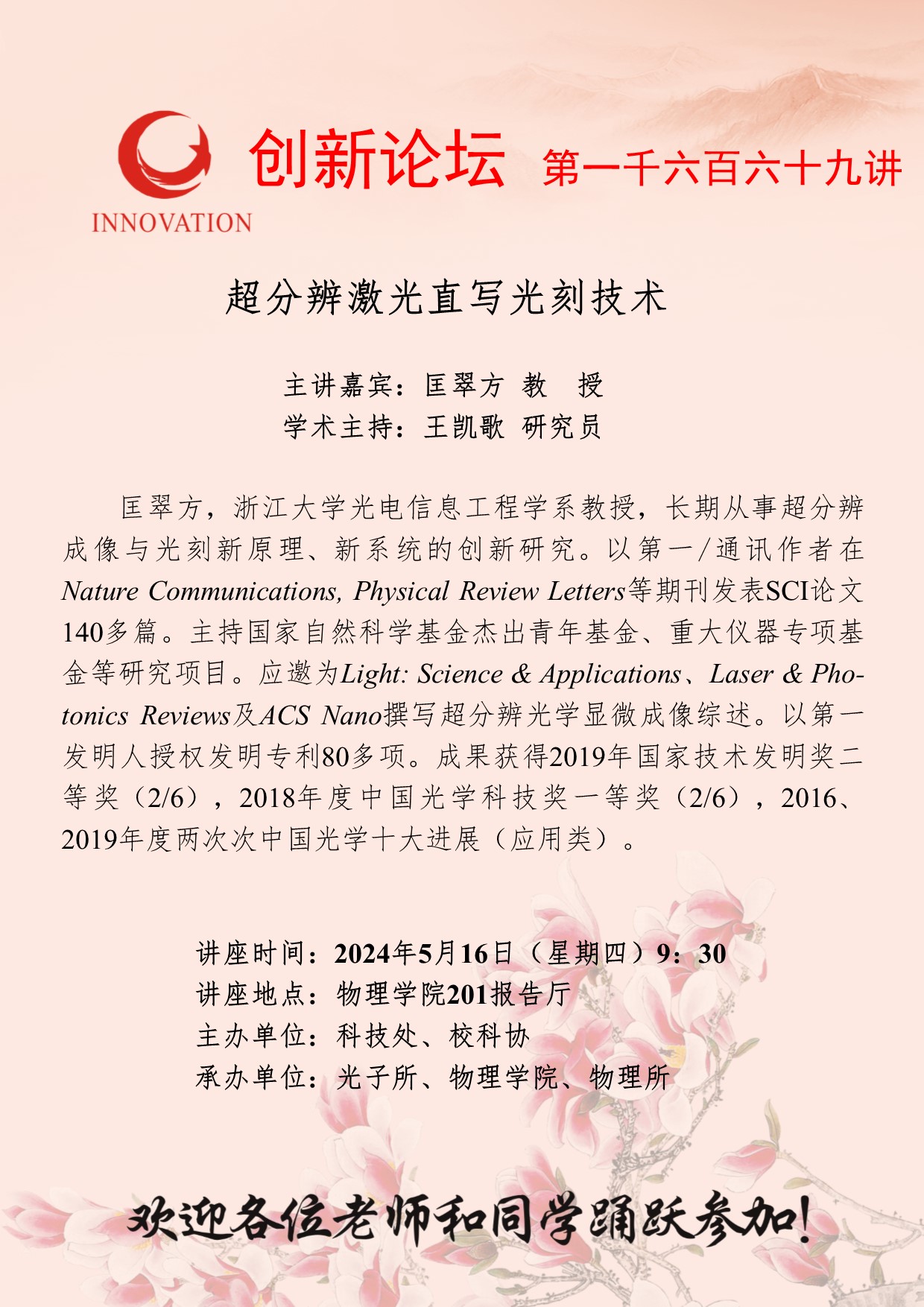 匡翠方 教 授 bat365正版唯一官网创新论坛第一千六百六十九讲:超分辨激光直写光刻技术 讲座时间 2024年5月16日(星期四)9:30 讲座地点 物理学院201报告厅 讲座人介绍 匡翠方 教 授 讲座内容