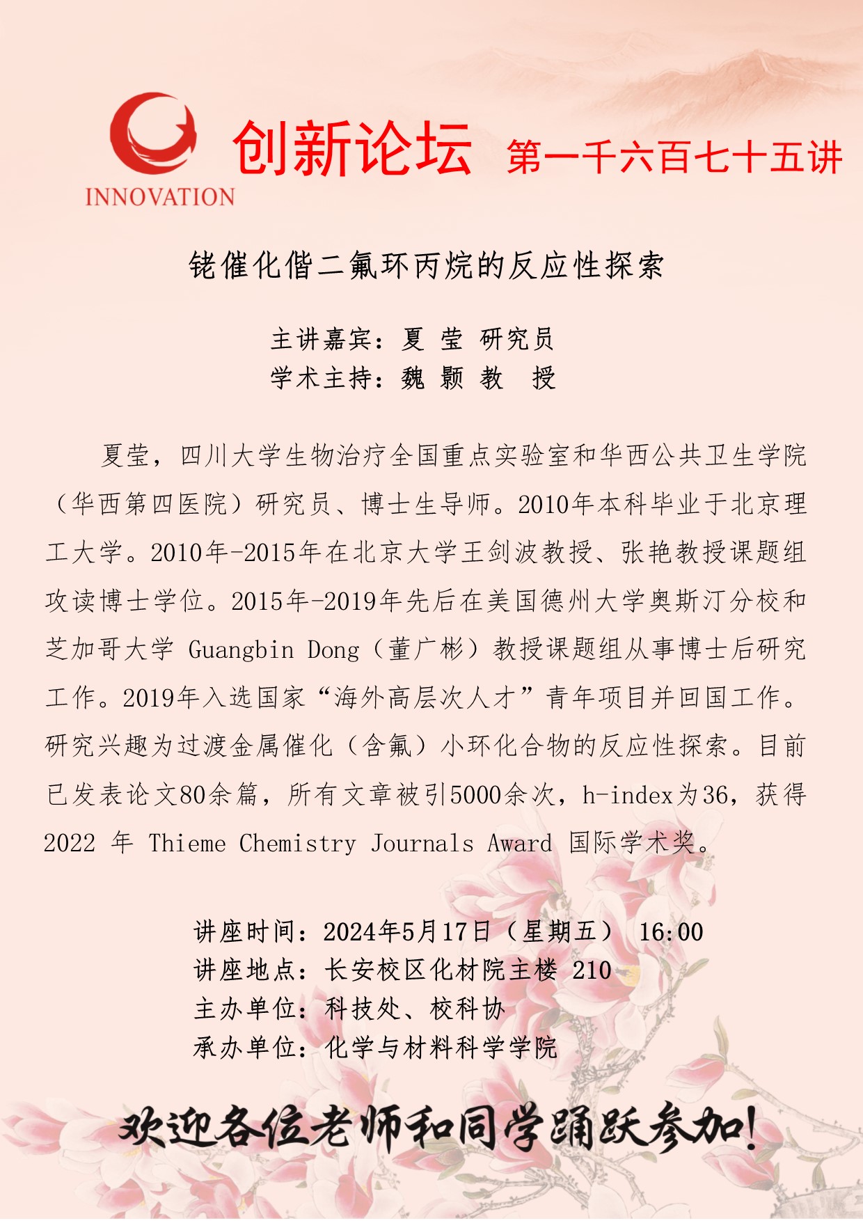 夏莹 研究员 bat365正版唯一官网创新论坛第一千六百七十五讲:铑催化偕二氟环丙烷的反应性探索 讲座时间 2024年5月17日(星期五) 16:00 讲座地点 长安校区化材院主楼 210 讲座人介绍 夏莹 研究员 讲座内容