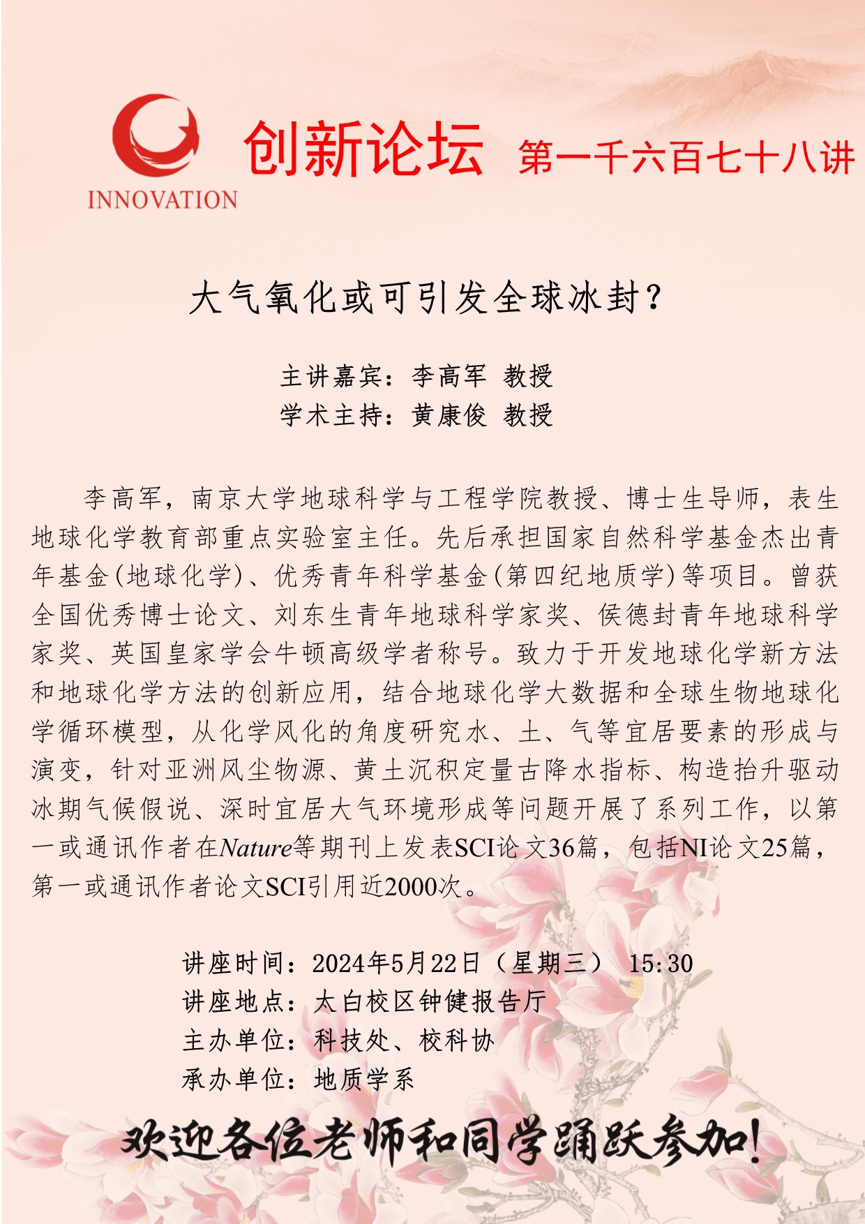 李高军 教授 bat365正版唯一官网创新论坛第一千六百七十八讲:大气氧化或可引发全球冰封? 讲座时间 2024年5月22日(星期三) 15:30 讲座地点 太白校区钟健报告厅 讲座人介绍 李高军 教授 讲座内容