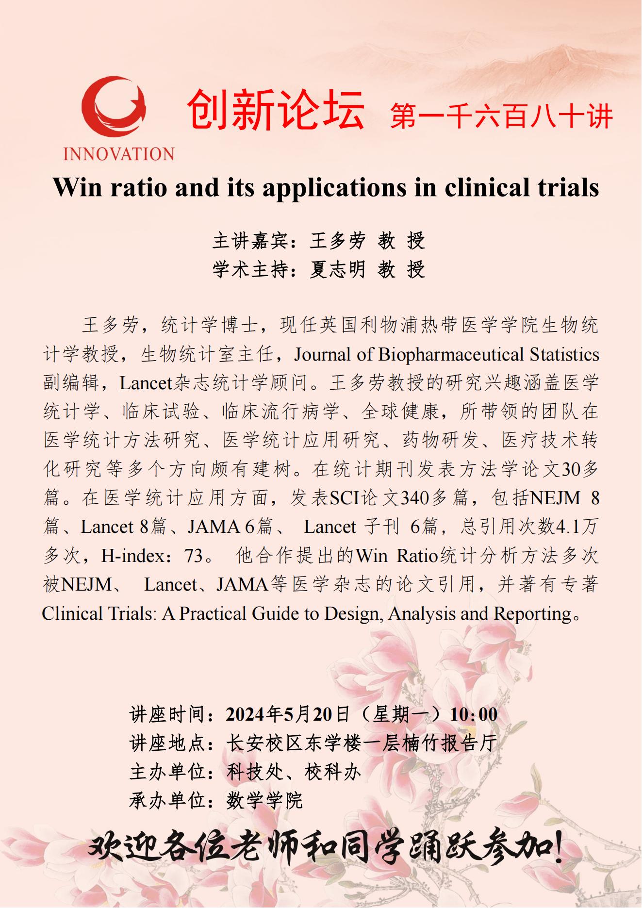 王多劳 教授 bat365正版唯一官网创新论坛第一千六百八十讲:Win ratio and its applications in clinical trials 讲座时间 2024年5月20日(星期一) 10:00 讲座地点 长安校区东学楼一层楠竹报告厅 讲座人介绍 王多劳 教授 讲座内容