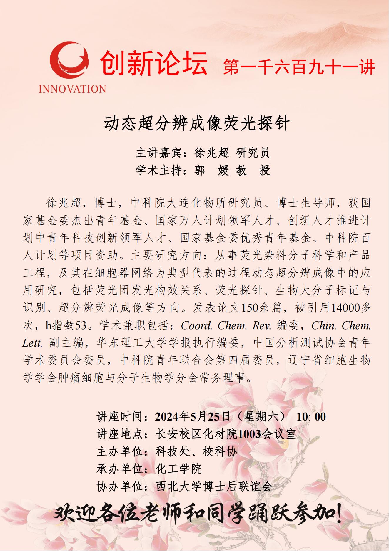 徐兆超 研究员 bat365正版唯一官网创新论坛第一千六百九十一讲:动态超分辨成像荧光探针 讲座时间 2024年5月25日(星期六) 10: 00 讲座地点 长安校区化材院1003会议室 讲座人介绍 徐兆超 研究员 讲座内容