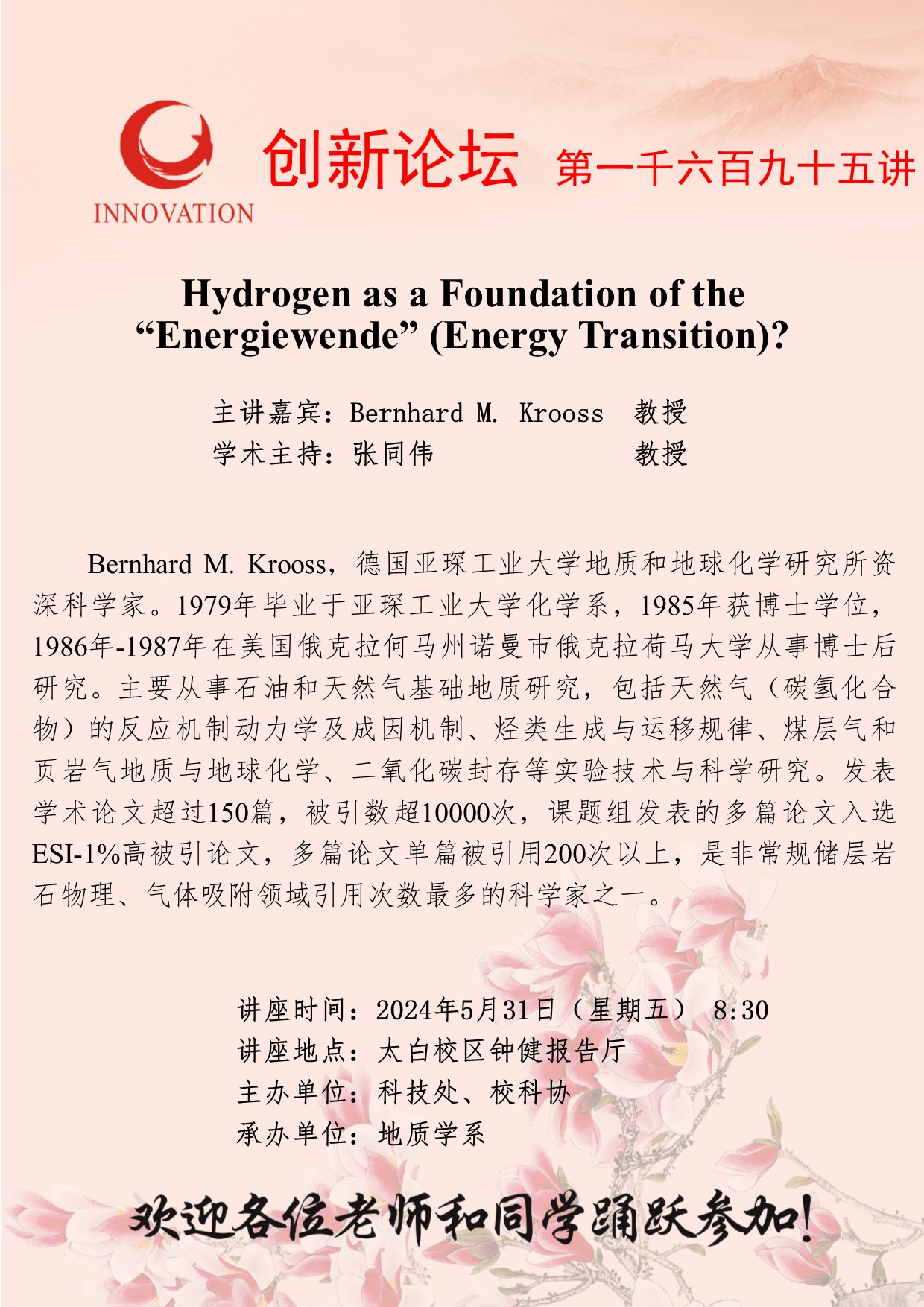 Bernhard M. Krooss 教授 bat365正版唯一官网创新论坛第一千六百九十五讲:Hydrogen as a Foundation of the “Energiewende” (Energy Transition)? 讲座时间 2024年5月31日(星期五) 8:30 讲座地点 太白校区钟健报告厅 讲座人介绍 Bernhard M. Krooss 教授 讲座内容