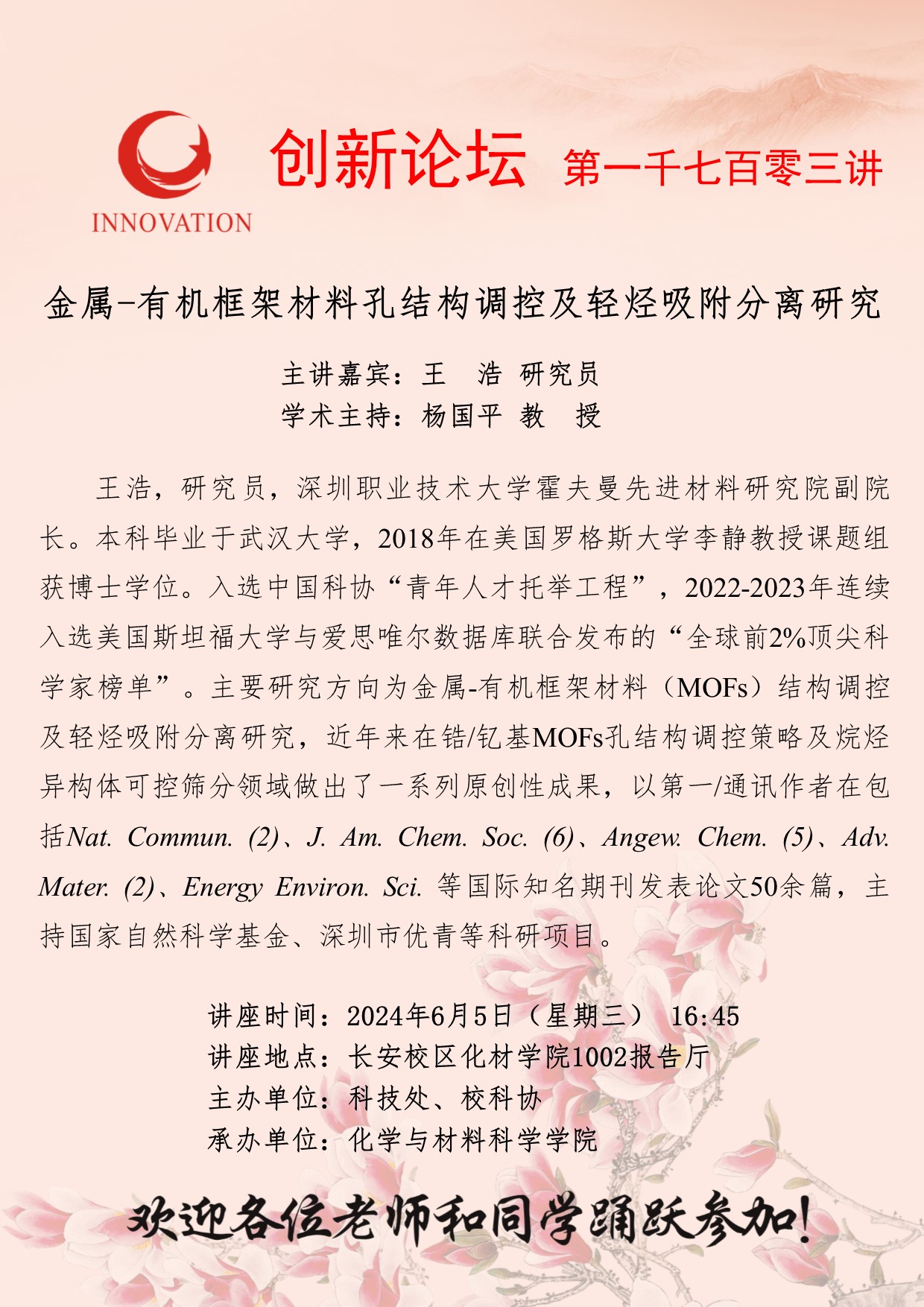 王浩 研究员 bat365正版唯一官网创新论坛第一千七百零三讲:金属-有机框架材料孔结构调控及轻烃吸附分离研究 讲座时间 2024年6月5日(星期三) 16:45 讲座地点 长安校区化材学院1002报告厅 讲座人介绍 王浩 研究员 讲座内容