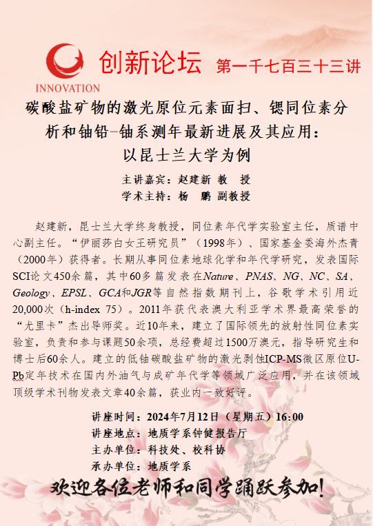 赵建新 教授 bat365正版唯一官网创新论坛第一千七百三十三讲:碳酸盐矿物的激光原位元素面扫、锶同位素分析和铀铅-铀系测年最新进展及其应用:以昆士兰大学为例 讲座时间 2024年7月12日(星期五)16:00 讲座地点 地质学系钟健报告厅 讲座人介绍 赵建新 教授 讲座内容