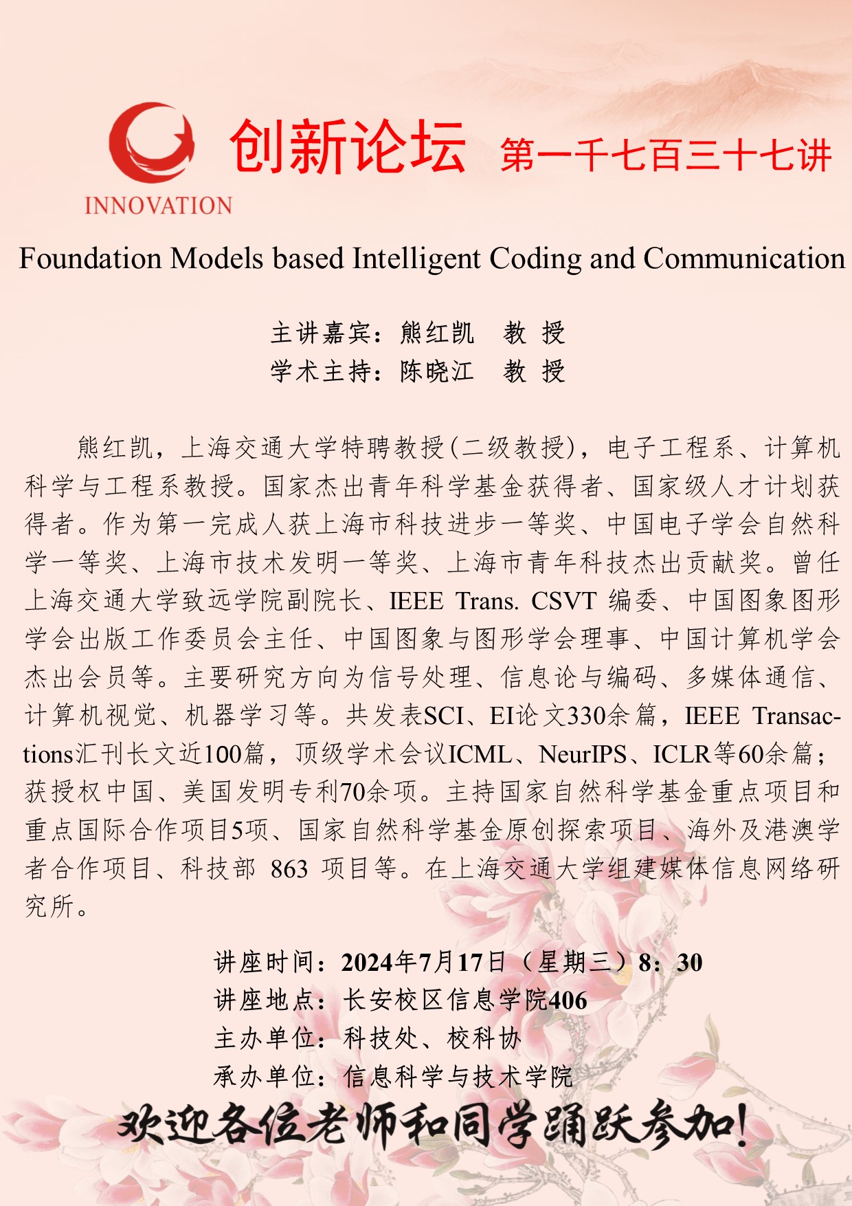 熊红凯 教授 bat365正版唯一官网创新论坛第一千七百三十七讲:Foundation Models based Intelligent Coding and Communication 讲座时间 2024年7月17日(星期三)8:30 讲座地点 长安校区信息学院406 讲座人介绍 熊红凯 教授 讲座内容