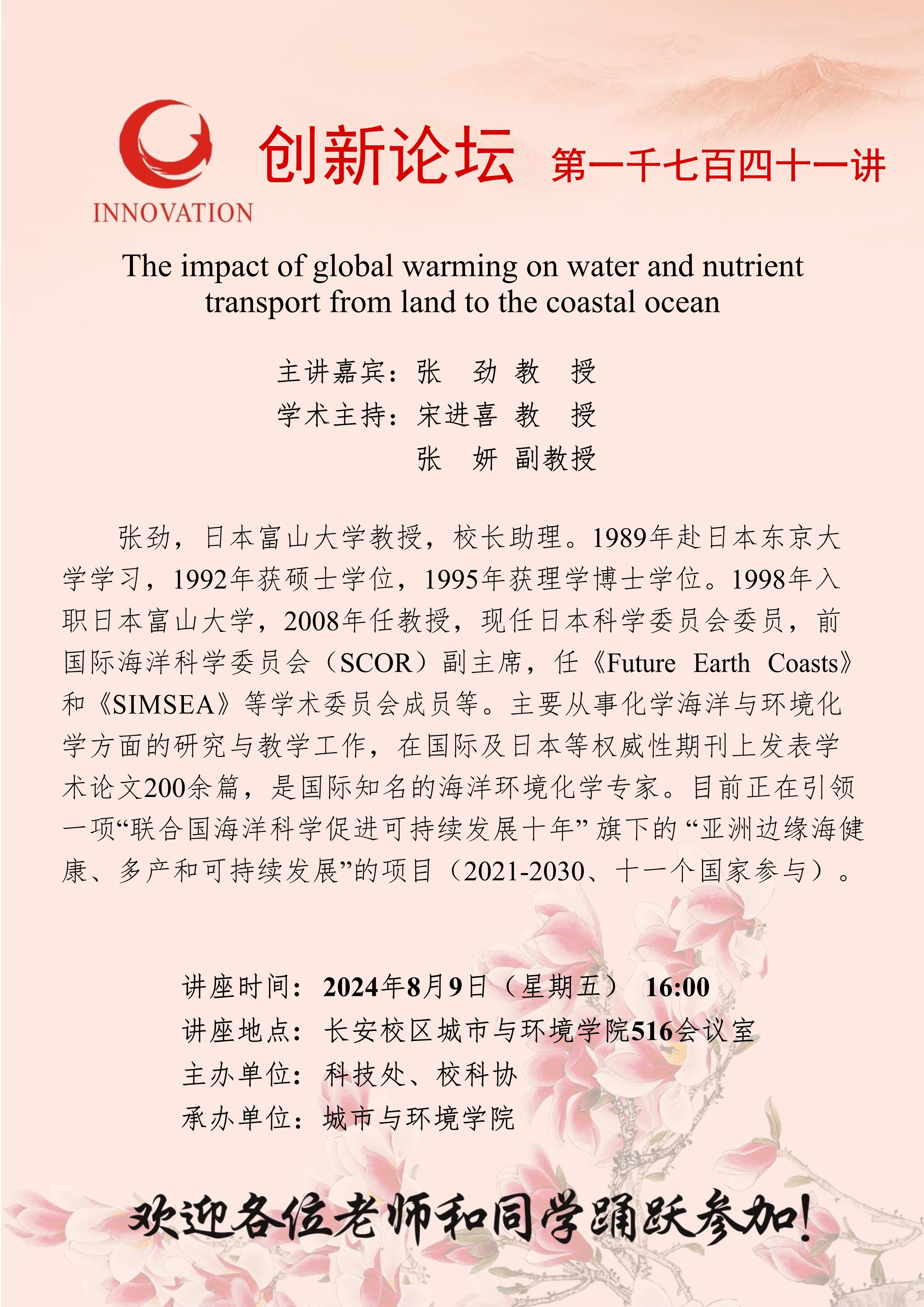 张劲 教授 bat365正版唯一官网创新论坛第一千七百四十一讲:The impact of global warming on water and nutrient transport from land to the coastal ocean 讲座时间 2024年8月9日(星期五)16:00 讲座地点 长安校区城市与环境学院516会议室 讲座人介绍 张劲 教授 讲座内容