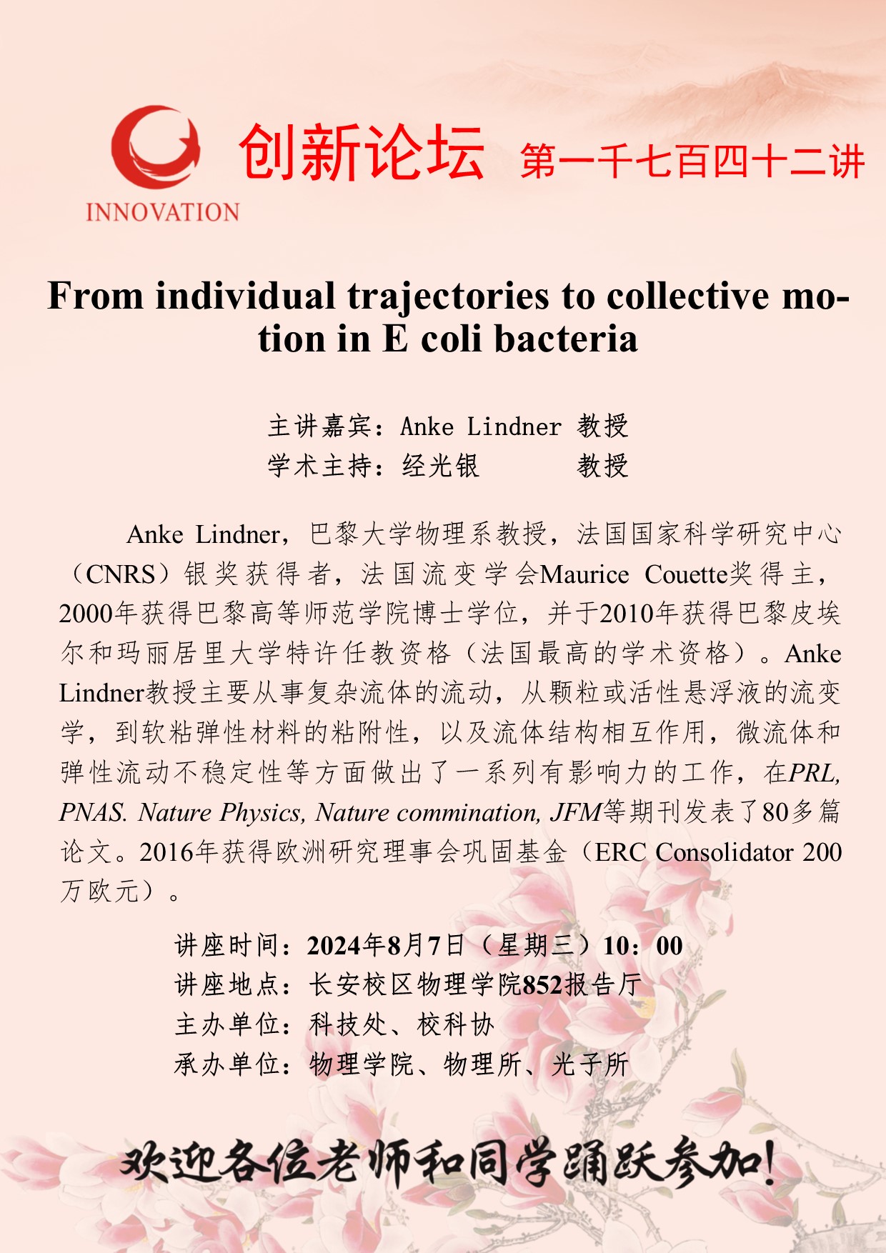Anke Lindner 教授 bat365正版唯一官网创新论坛第一千七百四十二讲:From individual trajectories to collective motion in E coli bacteria 讲座时间 2024年8月7日(星期三)10:00 讲座地点 长安校区物理学院852报告厅 讲座人介绍 Anke Lindner 教授 讲座内容