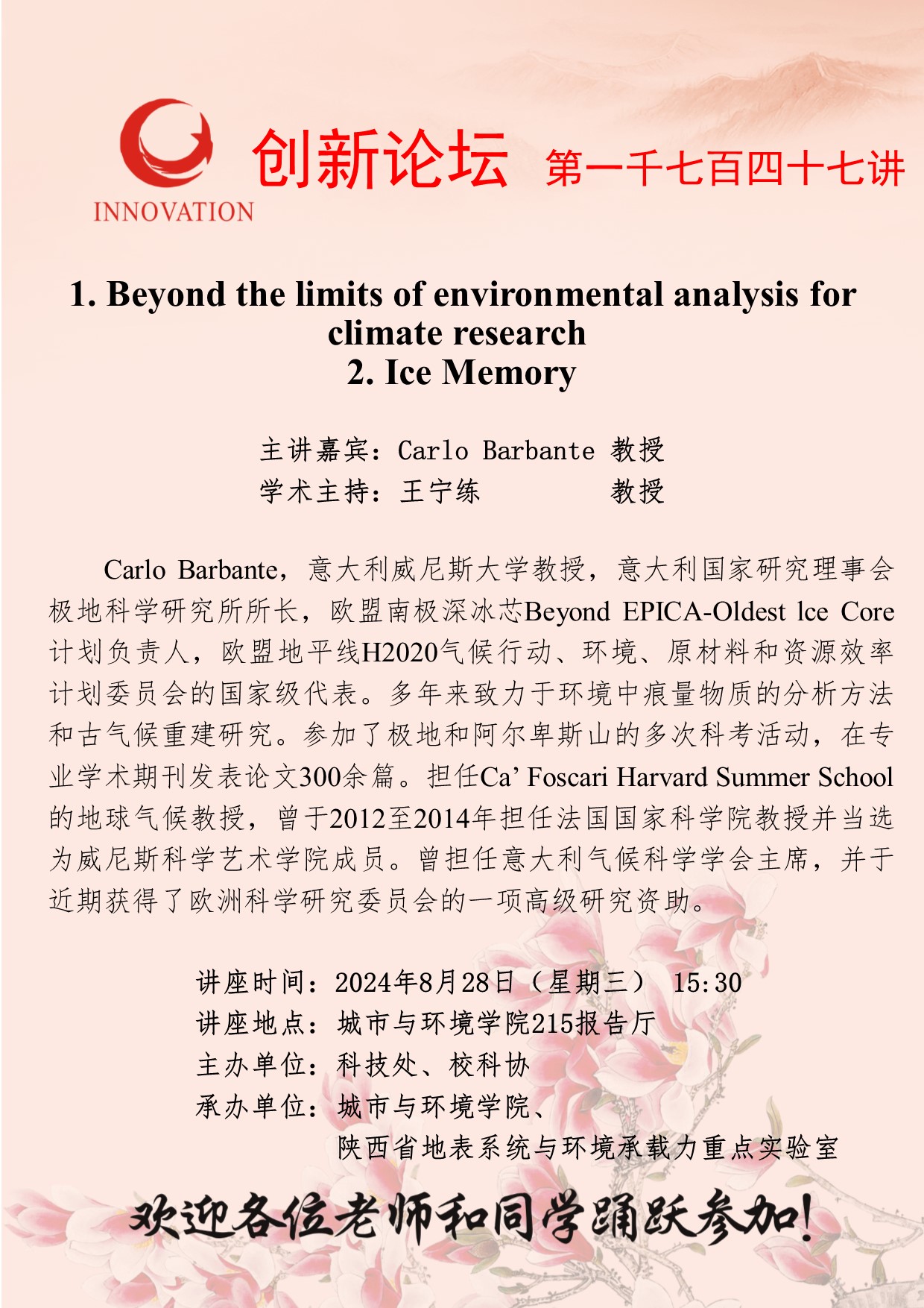 Carlo Barbante 教授 bat365正版唯一官网创新论坛第一千七百四十七讲:1. Beyond the limits of environmental analysis for climate research 2. Ice Memory 讲座时间 2024年8月28日(星期三) 15:30 讲座地点 城市与环境学院215报告厅 讲座人介绍 Carlo Barbante 教授 讲座内容
