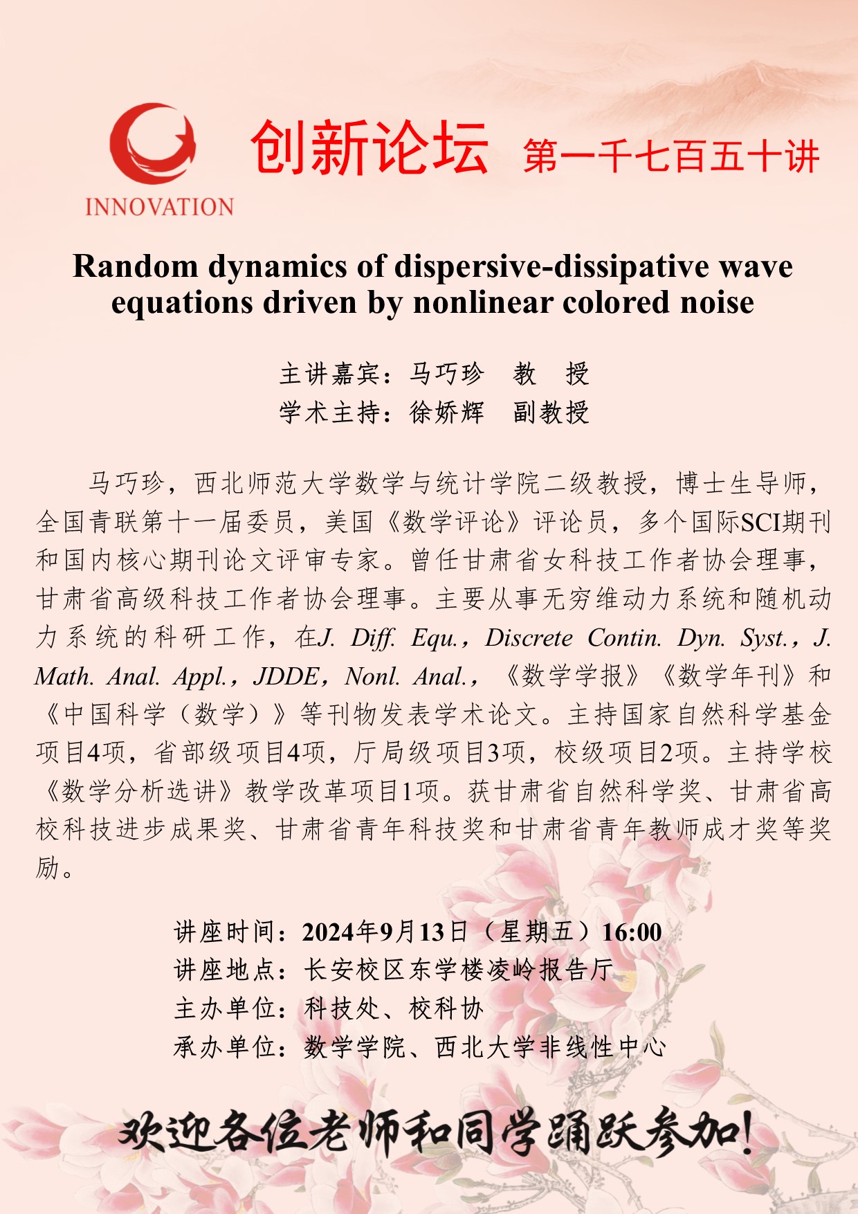 马巧珍 教授 bat365正版唯一官网创新论坛第一千七百五十讲:Random dynamics of dispersive-dissipative wave equations driven by nonlinear colored noise 讲座时间 2024年9月13日(星期五)16:00 讲座地点 长安校区东学楼凌岭报告厅 讲座人介绍 马巧珍 教授 讲座内容