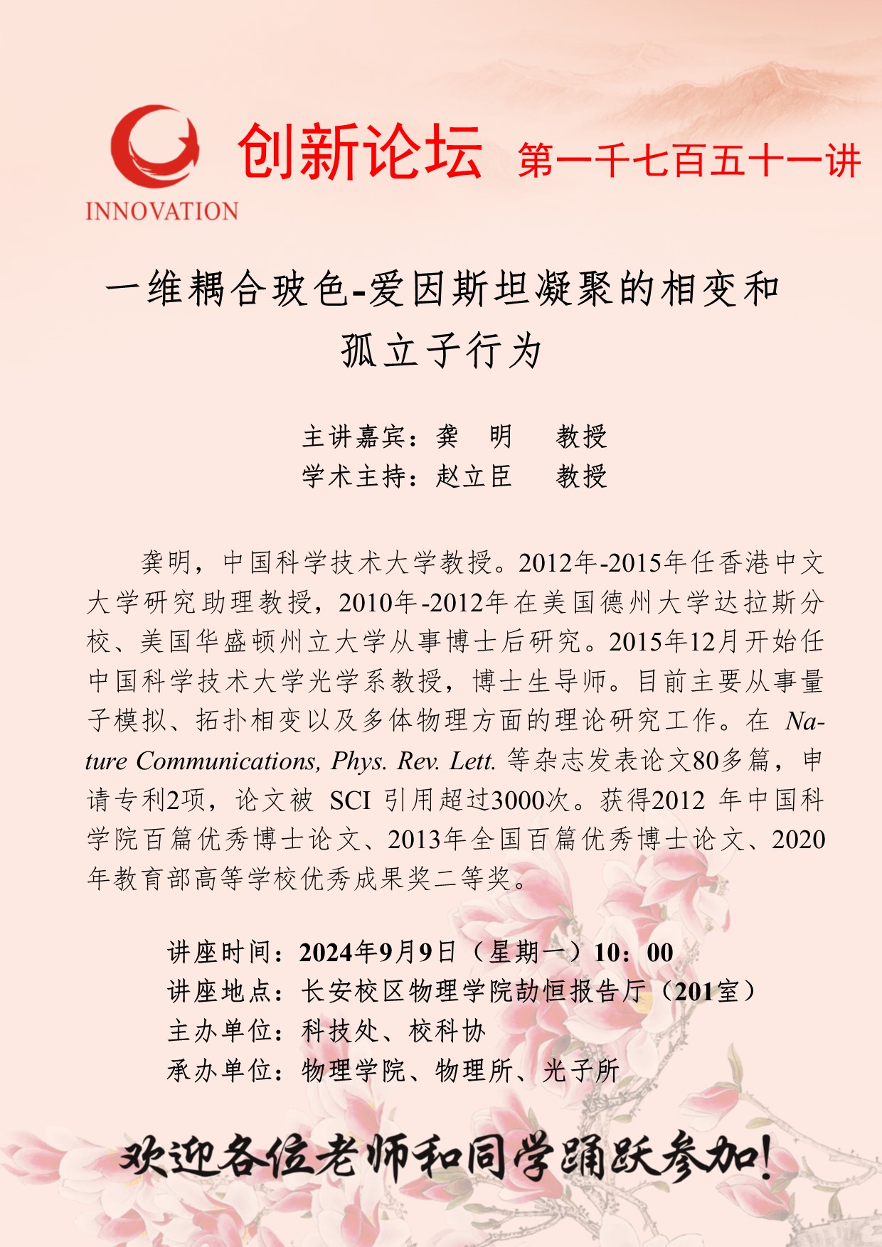 龚明 教授 bat365正版唯一官网创新论坛第一千七百五十一讲:一维耦合玻色-爱因斯坦凝聚的相变和孤立子行为 讲座时间 2024年9月9日(星期一)10:00 讲座地点 长安校区物理学院劼恒报告厅(201室) 讲座人介绍 龚明 教授 讲座内容
