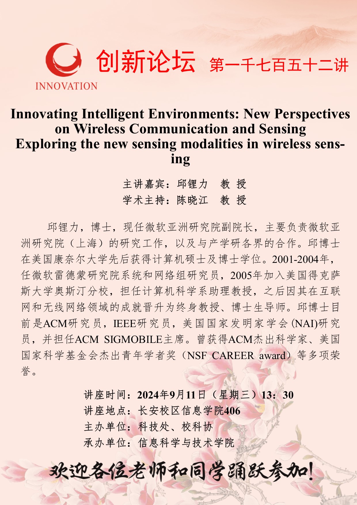邱锂力 教授 bat365正版唯一官网创新论坛第一千七百五十二讲:Innovating Intelligent Environments: New Perspectives on Wireless Communication and Sensing Exploring the new sensing modalities in wireless sensing 讲座时间 2024年9月11日(星期三)13:30 讲座地点 长安校区信息学院406 讲座人介绍 邱锂力 教授 讲座内容