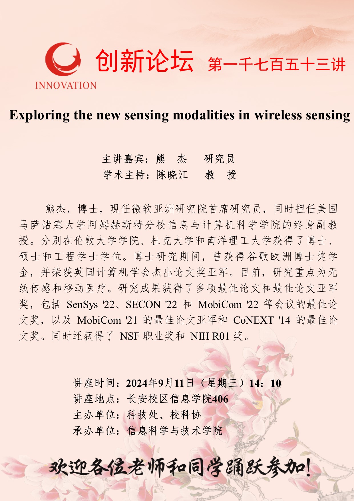 熊杰 研究员 bat365正版唯一官网创新论坛第一千七百五十三讲:Exploring the new sensing modalities in wireless sensing 讲座时间 2024年9月11日(星期三)14:10 讲座地点 长安校区信息学院406 讲座人介绍 熊杰 研究员 讲座内容