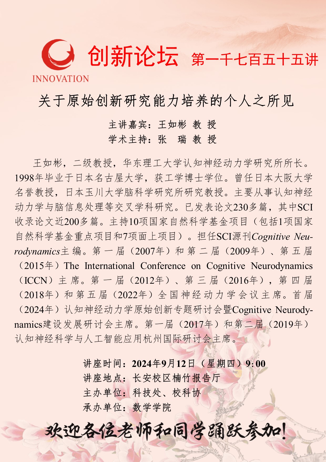 王如彬 教授 bat365正版唯一官网创新论坛第一千七百五十五讲:关于原始创新研究能力培养的个人之所见 讲座时间 2024年9月12日(星期四)9:00 讲座地点 长安校区楠竹报告厅 讲座人介绍 王如彬 教授 讲座内容