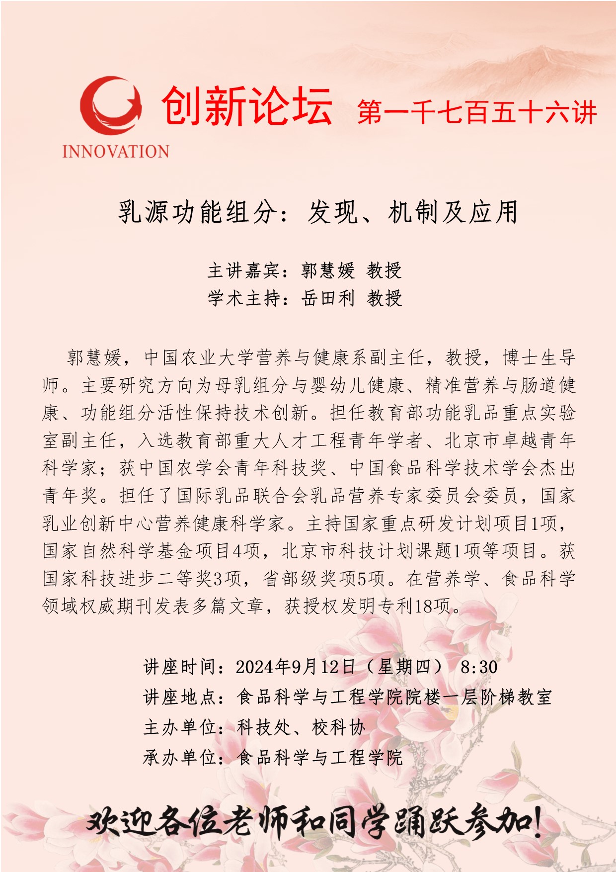 郭慧媛 教授 bat365正版唯一官网创新论坛第一千七百五十六讲: 乳源功能组分: 发现、机制及应用 讲座时间 2024年9月12日(星期四) 8:30 讲座地点 食品科学与工程学院院楼一层阶梯教室 讲座人介绍 郭慧媛 教授 讲座内容