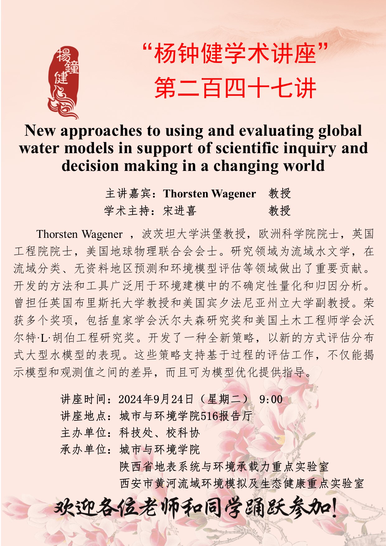 Thorsten Wagener 教授 “杨钟健学术讲座”第二百四十七讲:New approaches to using and evaluating global water models in support of scientific inquiry and decision making in a changing world 讲座时间 2024年9月24日(星期二) 9:00 讲座地点 城市与环境学院516报告厅 讲座人介绍 Thorsten Wagener 教授 讲座内容