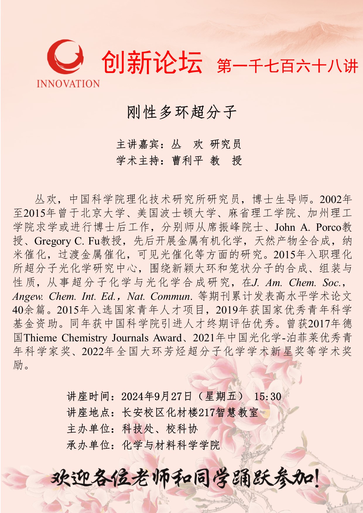 丛欢 研究员 bat365正版唯一官网创新论坛第一千七百六十八讲:刚性多环超分子 讲座时间 2024年9月27日(星期五) 15:30 讲座地点 长安校区化材楼217智慧教室 讲座人介绍 丛欢 研究员 讲座内容