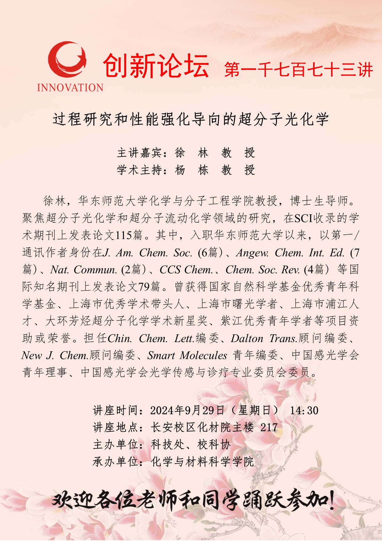 徐林 教授 bat365正版唯一官网创新论坛第一千七百七十三讲:过程研究和性能强化导向的超分子光化学 讲座时间 2024年9月29日(星期日) 14:30 讲座地点 长安校区化材院主楼 217 讲座人介绍 徐林 教授 讲座内容
