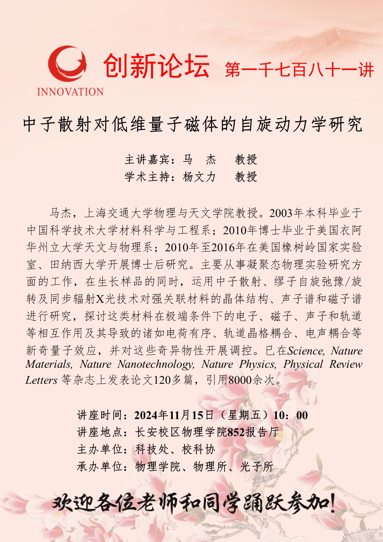 马杰 教授 bat365正版唯一官网创新论坛第一千七百八十一讲:中子散射对低维量子磁体的自旋动力学研究 讲座时间 2024年11月15日(星期五)10:00 讲座地点 长安校区物理学院852报告厅 讲座人介绍 马杰 教授 讲座内容