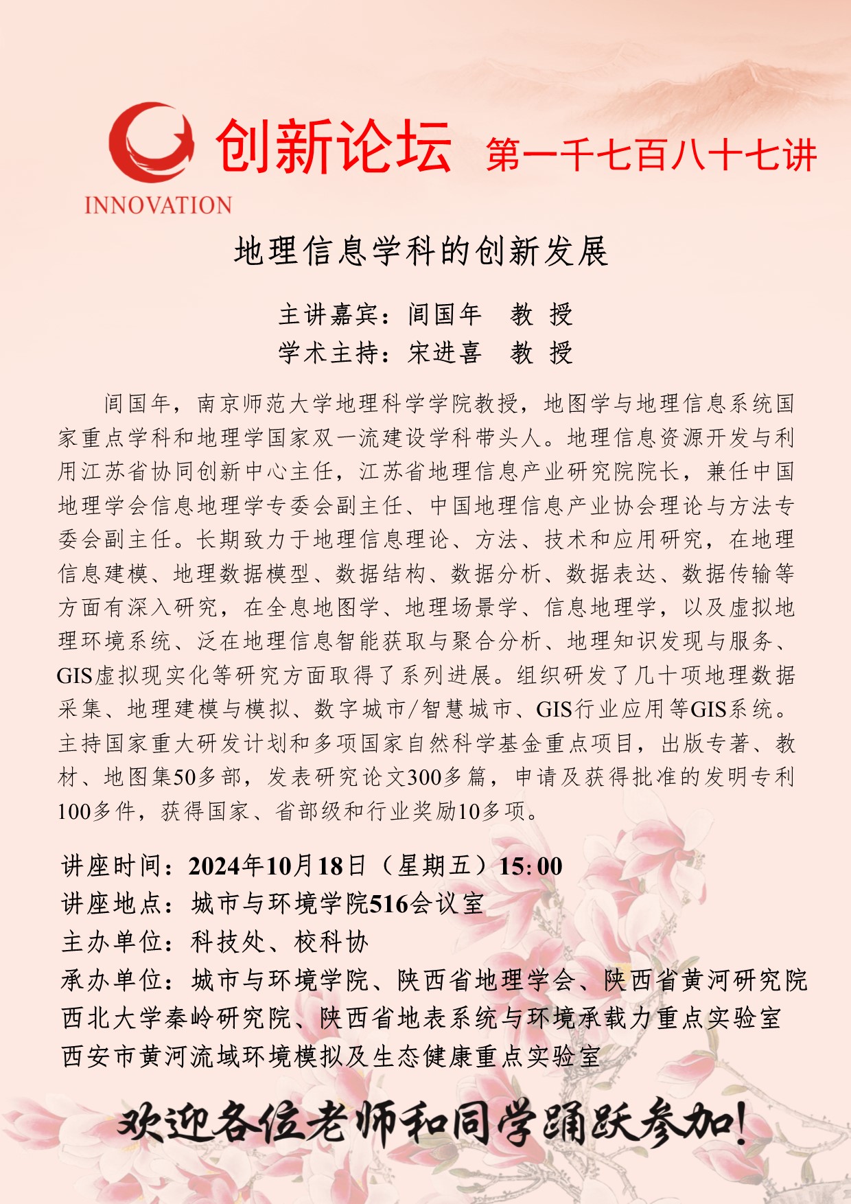 闾国年 教授 bat365正版唯一官网创新论坛第一千七百八十七讲:地理信息学科的创新发展 讲座时间 2024年10月18日(星期五)15:00 讲座地点 城市与环境学院516会议室 讲座人介绍 闾国年 教授 讲座内容