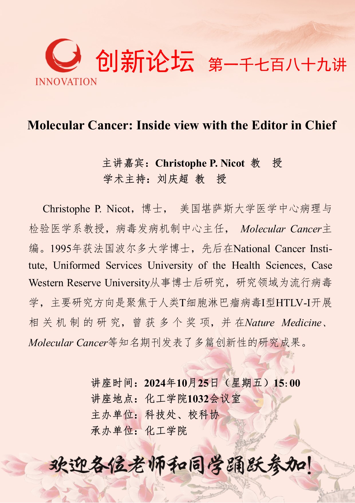 Christophe P. Nicot 教授 bat365正版唯一官网创新论坛第一千七百八十九讲:Molecular Cancer: Inside view with the Editor in Chief 讲座时间 2024年10月25日(星期五)15:00 讲座地点 化工学院1032会议室 讲座人介绍 Christophe P. Nicot 教授 讲座内容