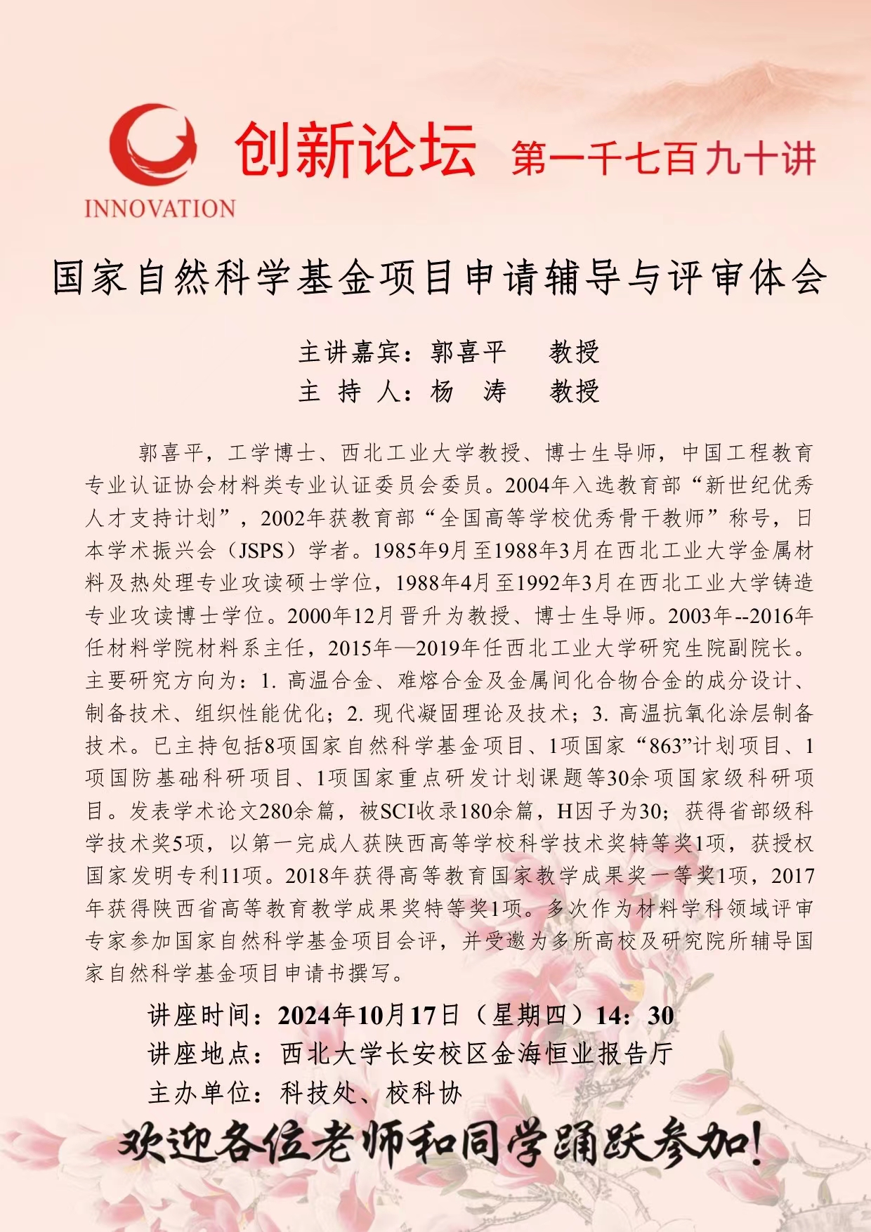 郭喜平 教授 bat365正版唯一官网创新论坛第一千七百九十讲:国家自然科学基金项目申请辅导与评审体会 讲座时间 2024年10月17日(星期四)下午2:30 讲座地点 bat365正版唯一官网长安校区金海恒业报告厅 讲座人介绍 郭喜平 教授 讲座内容