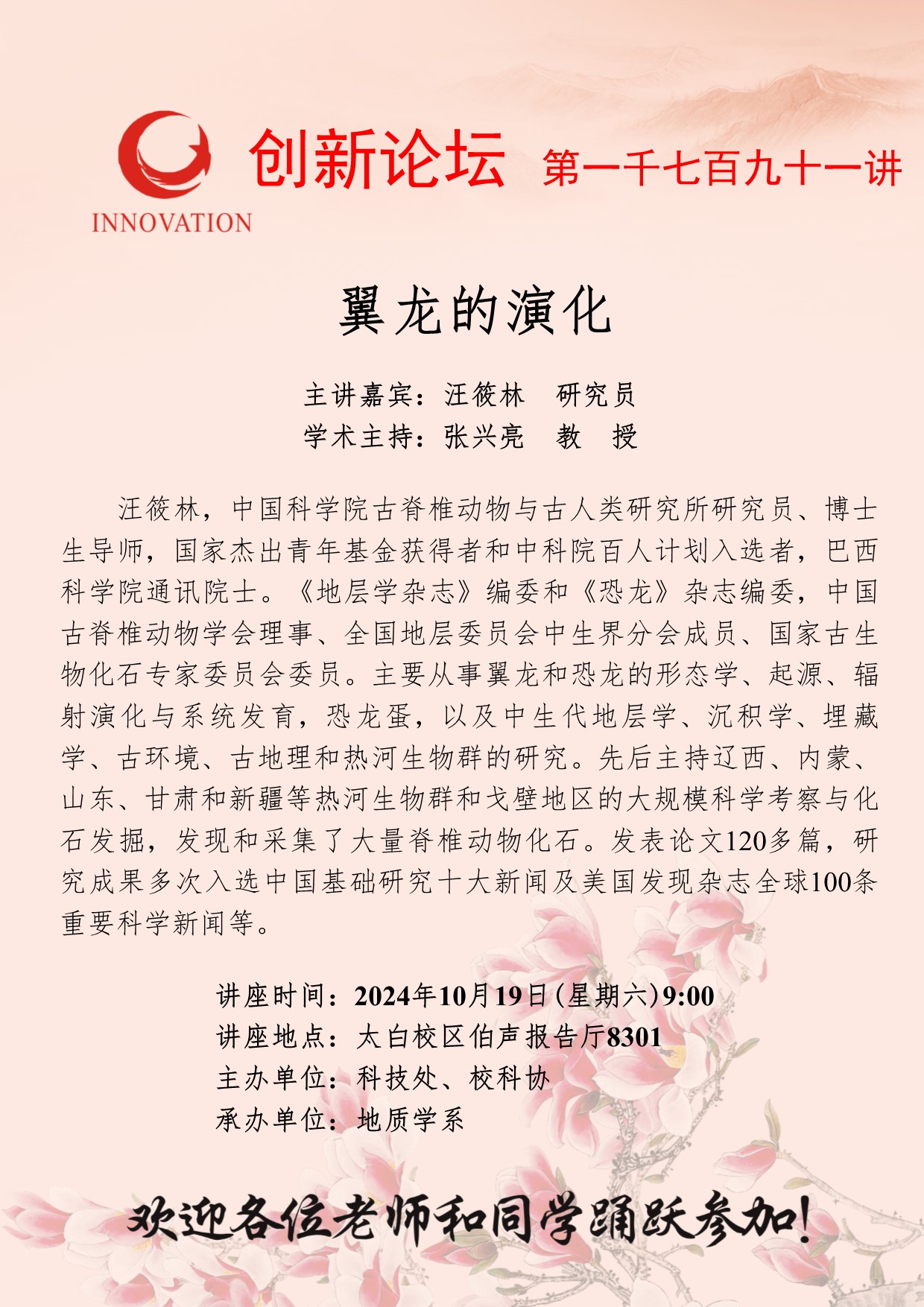 汪筱林 研究员 bat365正版唯一官网创新论坛第一千七百九十一讲:翼龙的演化 讲座时间 2024年10月19日(星期六)9:00 讲座地点 太白校区伯声报告厅8301 讲座人介绍 汪筱林 研究员 讲座内容