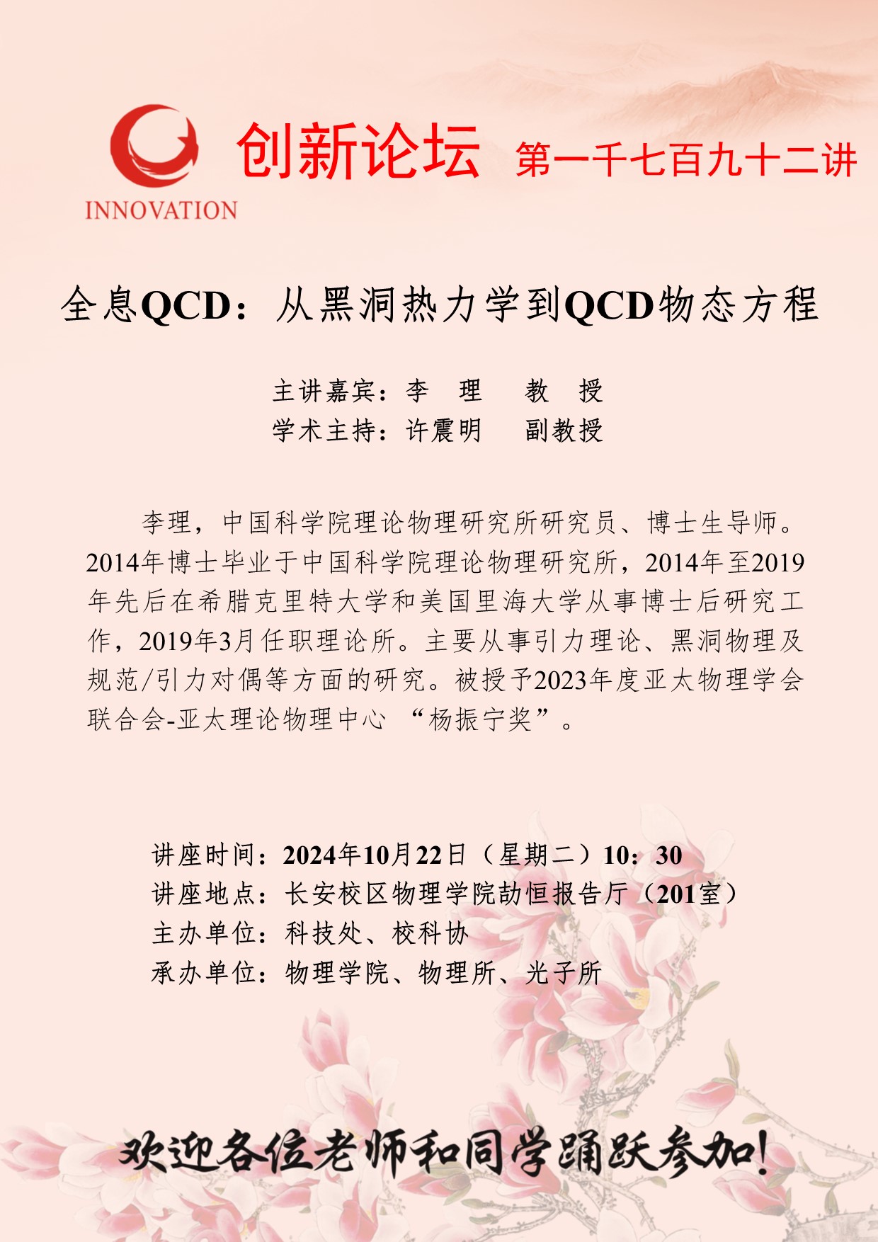 李理 教授 bat365正版唯一官网创新论坛第一千七百九十二讲:全息QCD:从黑洞热力学到QCD物态方程 讲座时间 2024年10月22日(星期二)10:30 讲座地点 长安校区物理学院劼恒报告厅(201室) 讲座人介绍 李理 教授 讲座内容