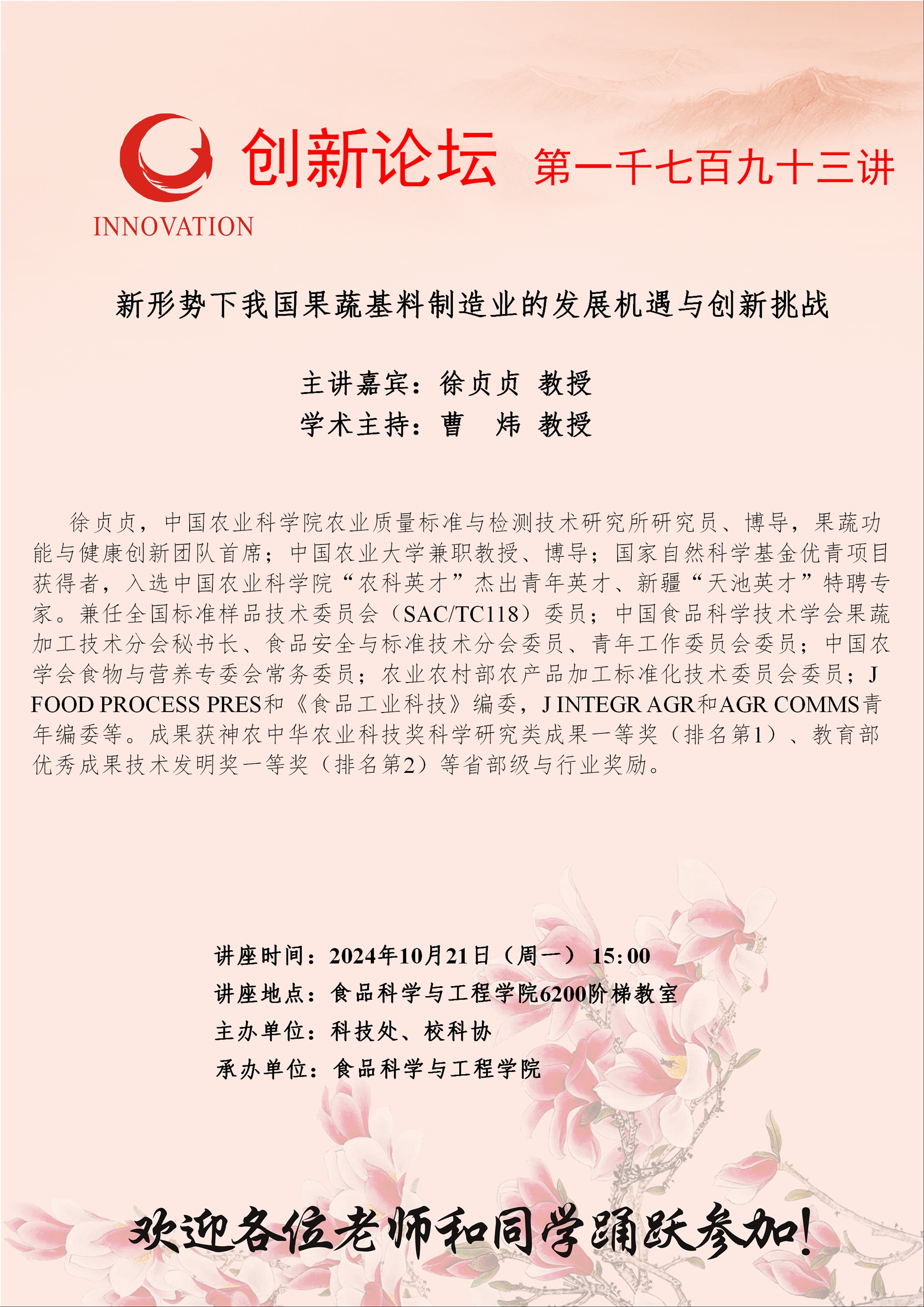 徐贞贞 教授 bat365正版唯一官网创新论坛第一千七百九十三讲: 新形势下我国果蔬基料制造业的发展机遇与创新挑战 讲座时间 2024年10月21日(星期一)15:00 讲座地点 太白校区食品科学与工程学院6200阶梯教室 讲座人介绍 徐贞贞 教授 讲座内容