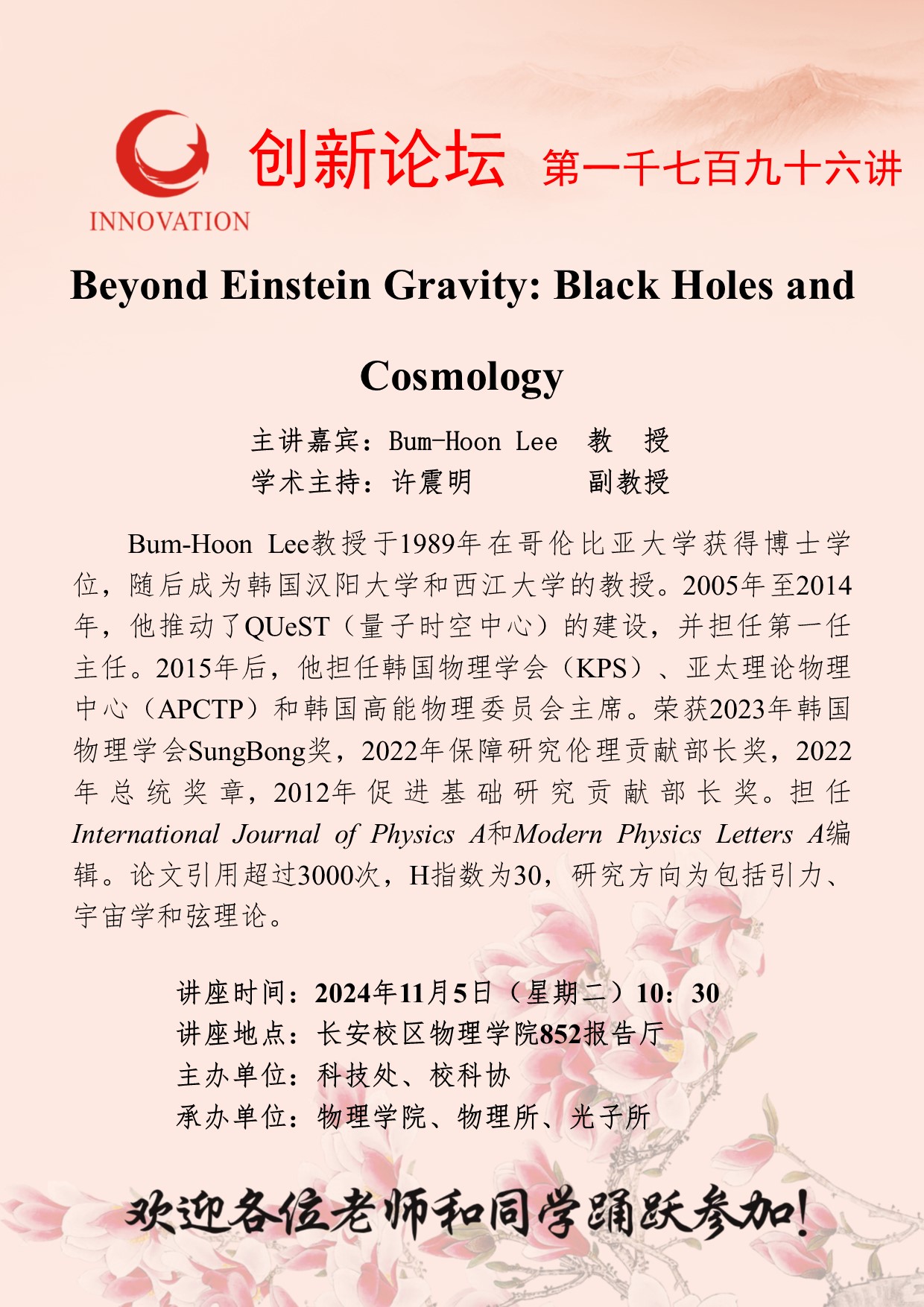 Bum-Hoon Lee 教授 bat365正版唯一官网创新论坛第一千七百九十六讲:Beyond Einstein Gravity: Black Holes and Cosmology 讲座时间 2024年11月5日(星期二)10:30 讲座地点 长安校区物理学院852报告厅 讲座人介绍 Bum-Hoon Lee 教授 讲座内容